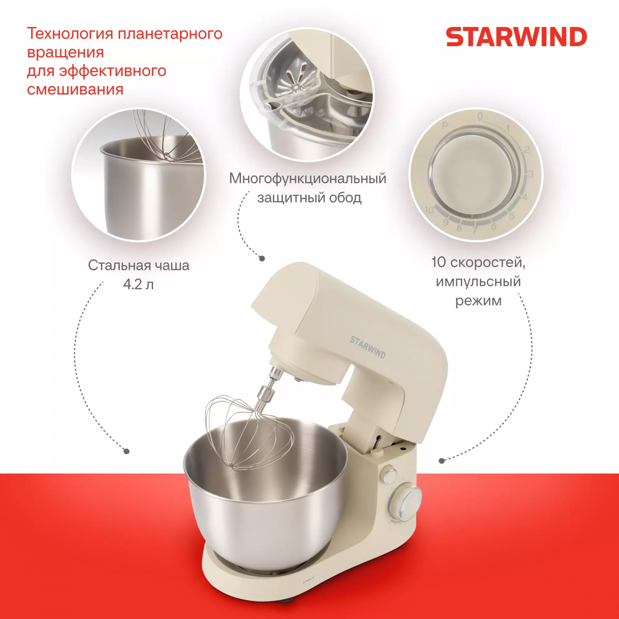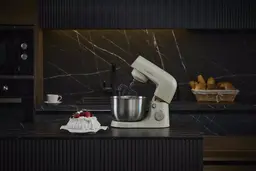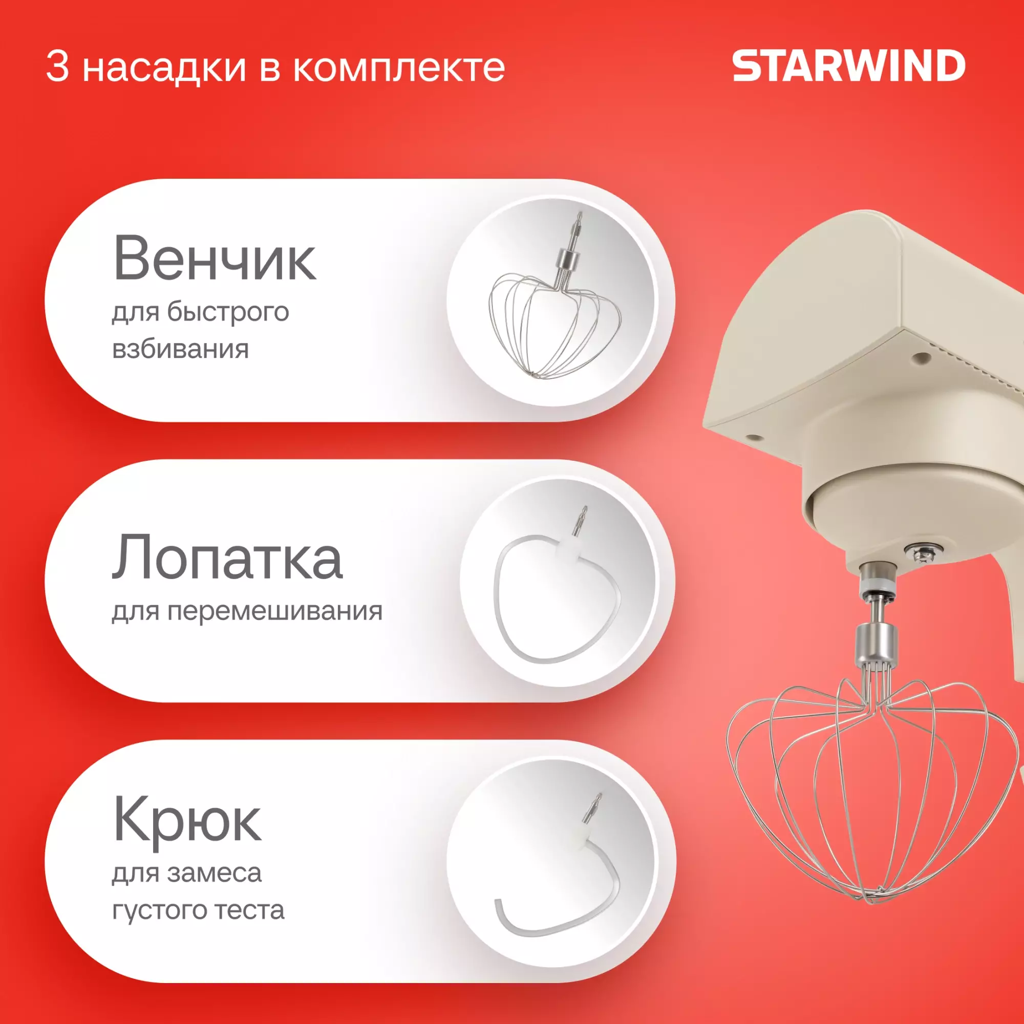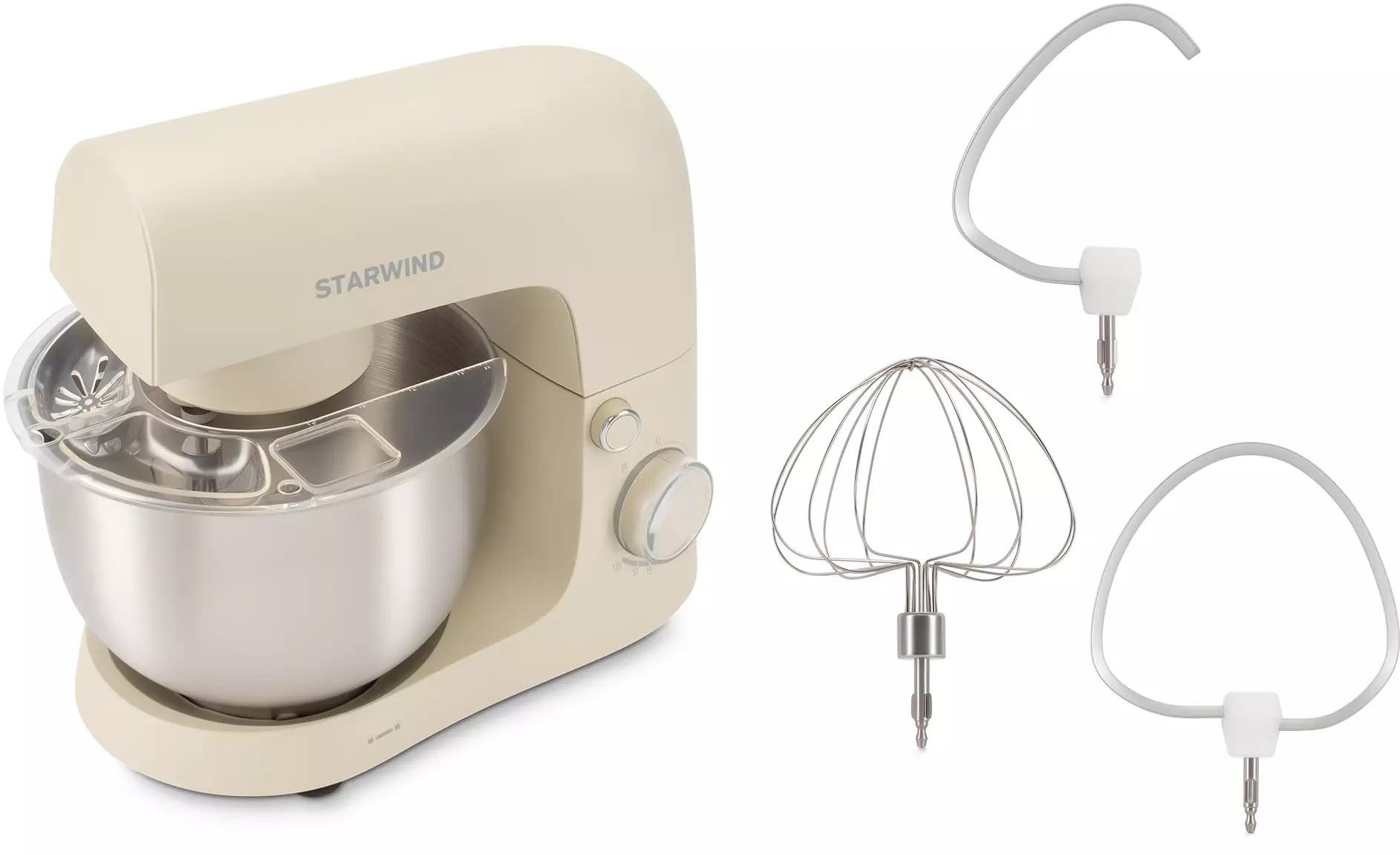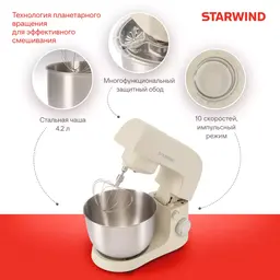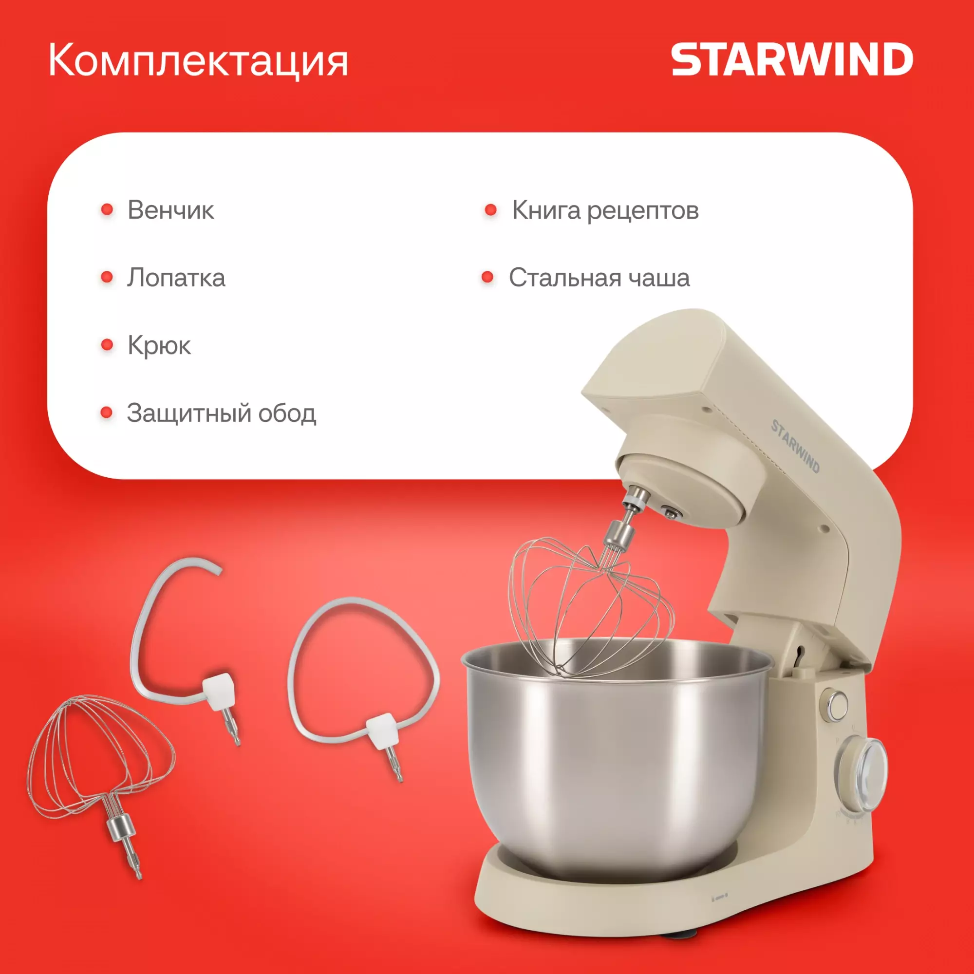 КомплектацияМиксер; насадка-крюк; насадка-венчик; насадка-лопатка; инструкция с гарантийным талоном; книга рецептов; мультифункциональный защитный обод