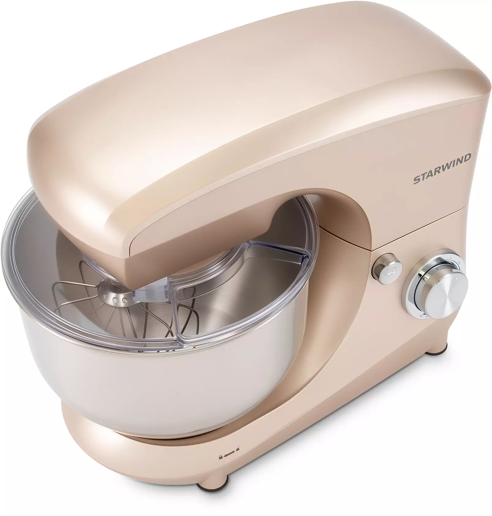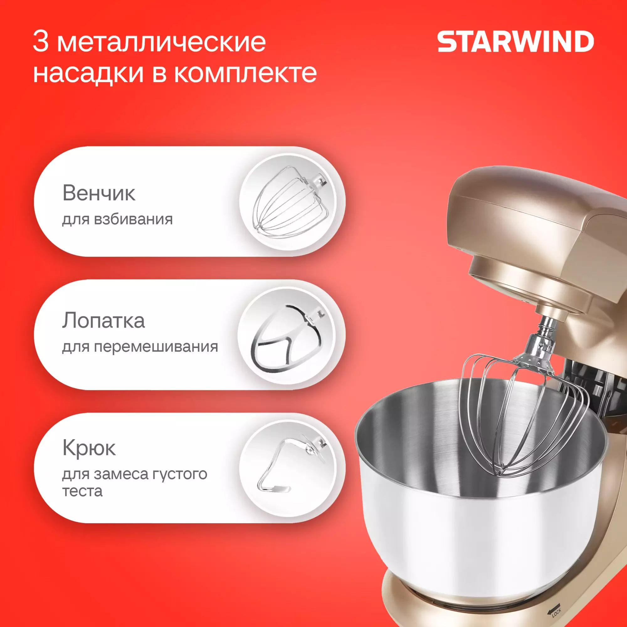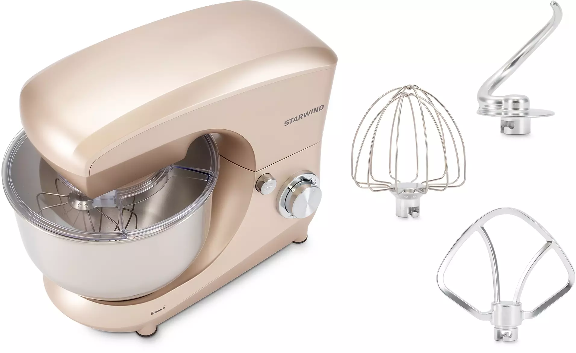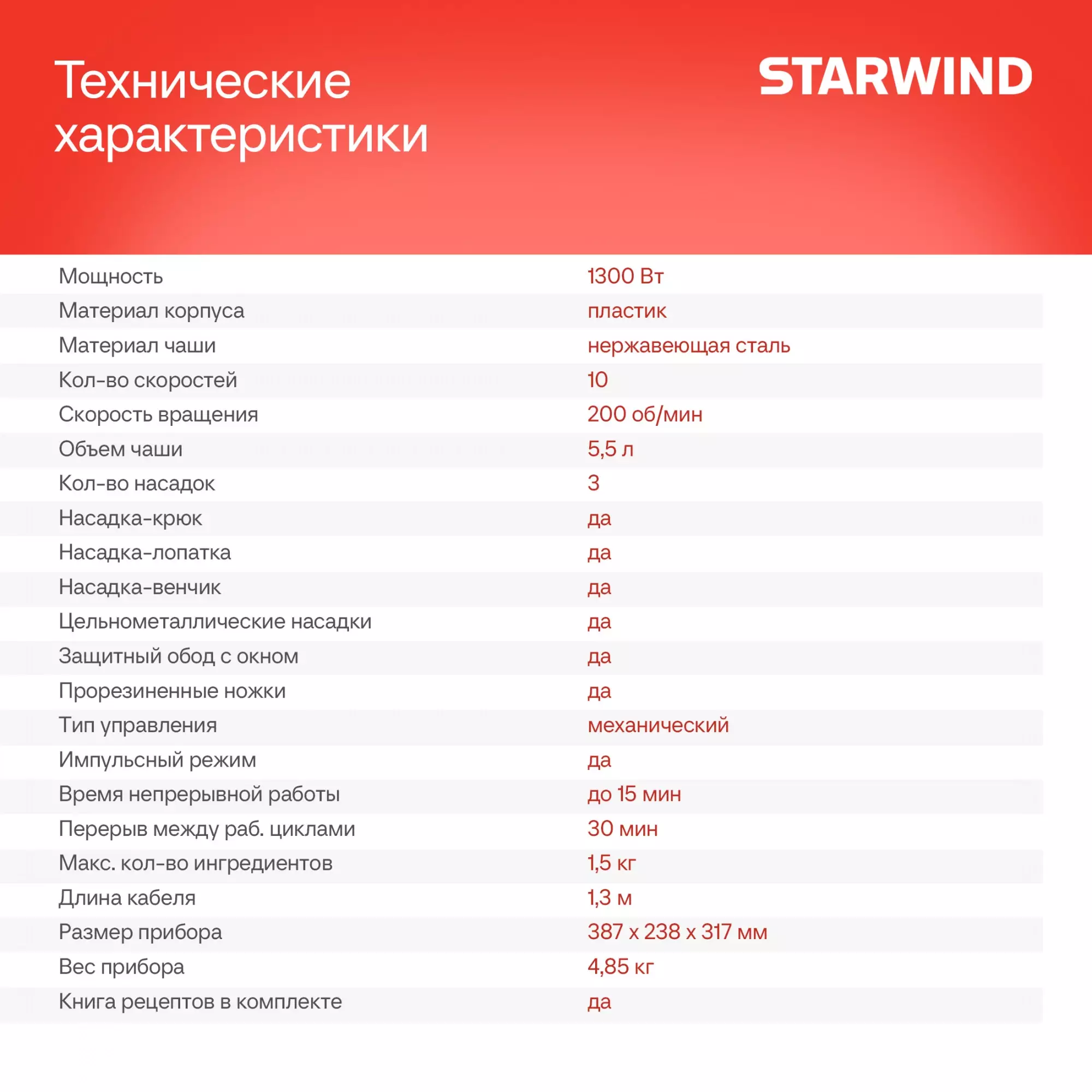 КомплектацияМиксер; чаша; защитная крышка для чаши; насадка-венчик; насадка-лопатка; насадка-крюк; руководство пользователя с гарантийным талоном; книга рецептов