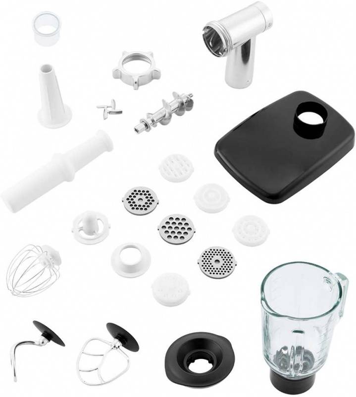 КомплектацияЧаша миксера, крышка миксера, венчик для взбивания, насадка для смешивания, крюк для теста, сепаратор для яиц. Блендер: чаша блендера, крышка блендера, мерный колпачок. Мясорубка: корпус, толкатель, загрузочный лоток, металлический шнек, нож, решетка (3 шт.), насадки для колбас кеббе, лапши