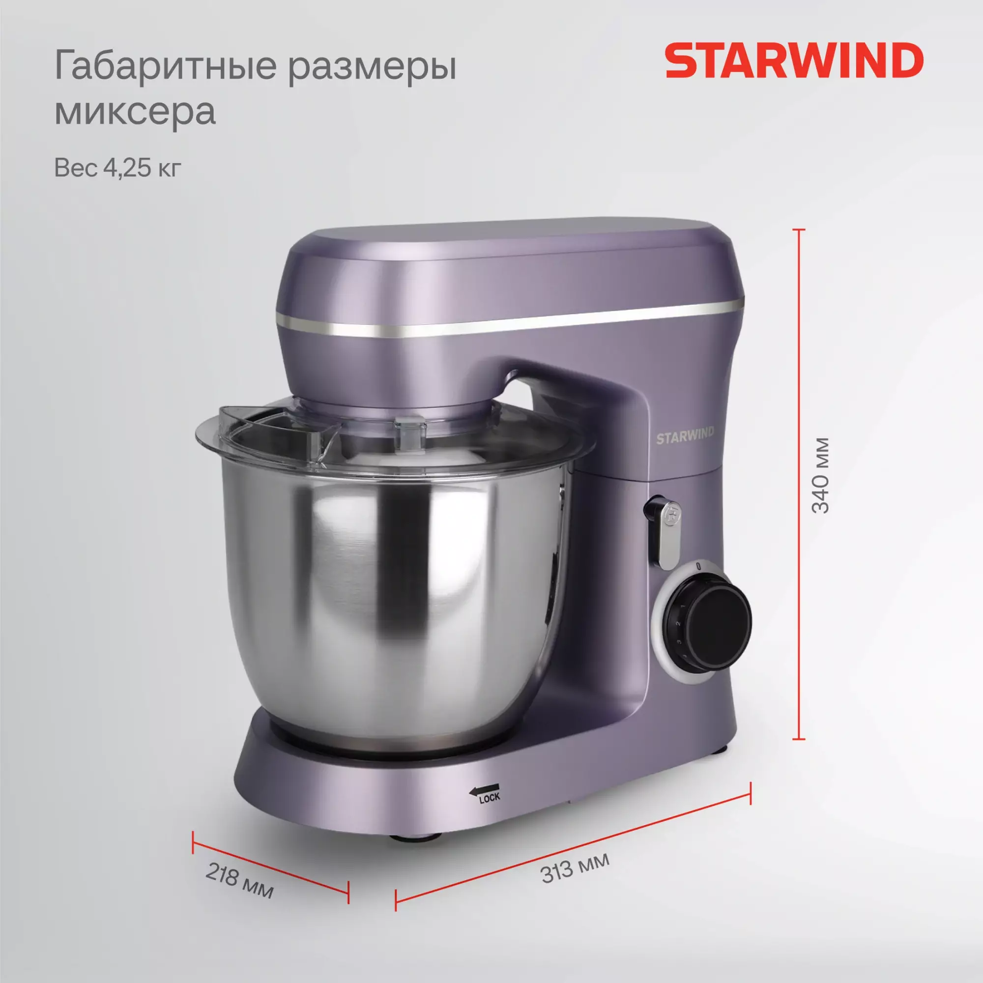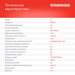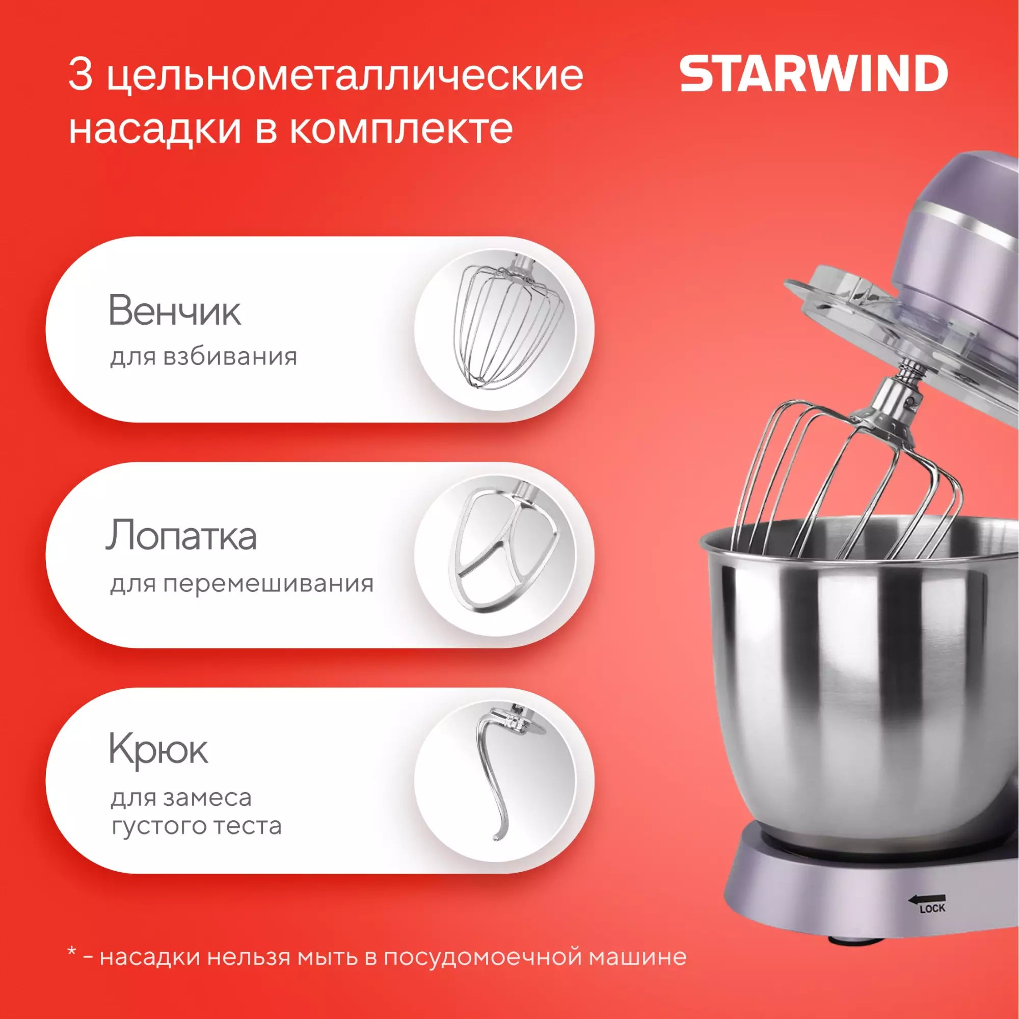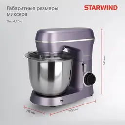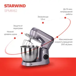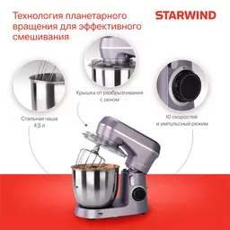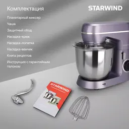 • Комплектация миксер; чаша; защитная крышка для чаши; насадка-венчик; насадка-крюк; насадка-лопатка; книга рецептов; инструкция с гарантийным талоном