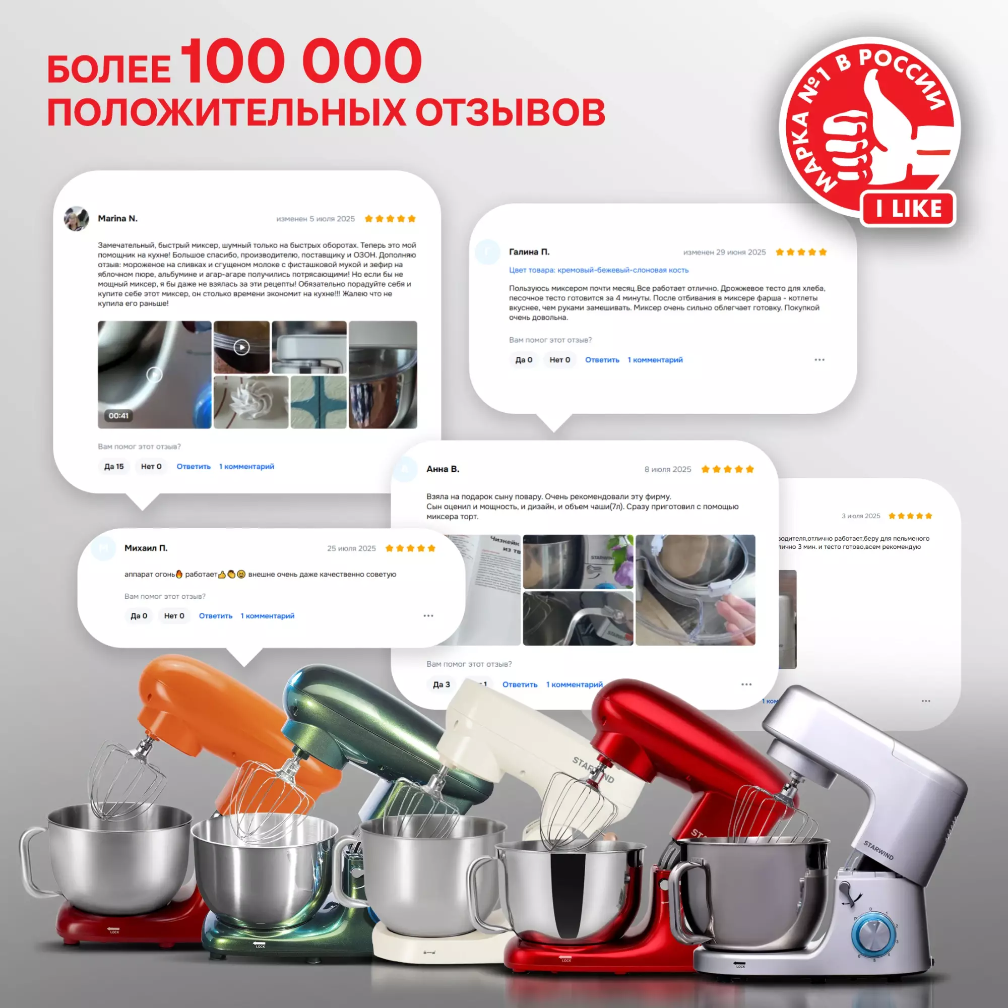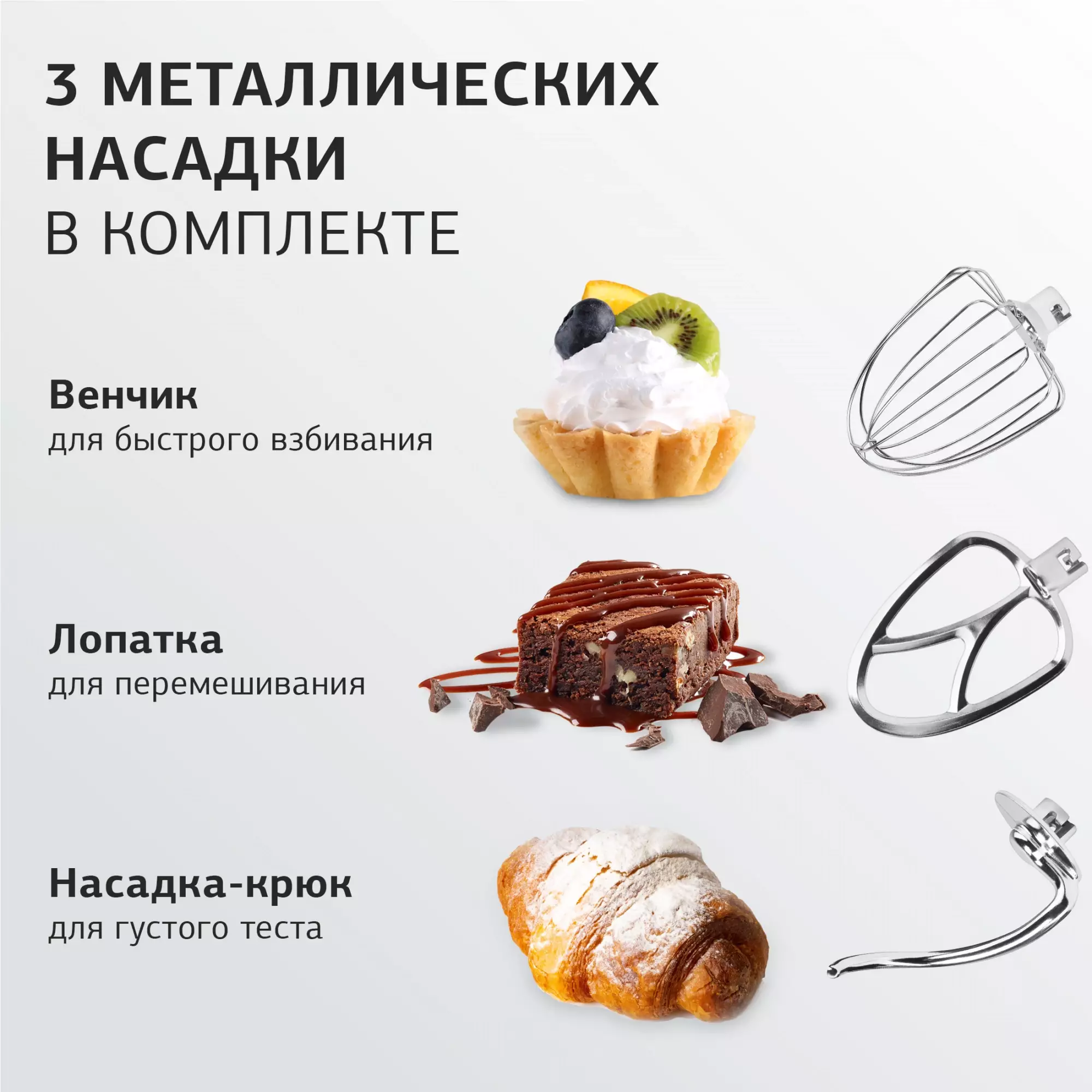 • Комплектация Миксер; чаша; защитная крышка для чаши; насадка-венчик; насадка-лопатка; насадка-крюк; книга рецептов; инструкция с гарантийным талоном