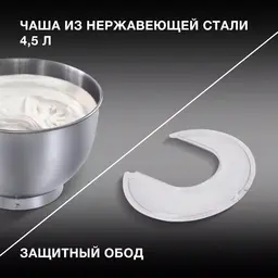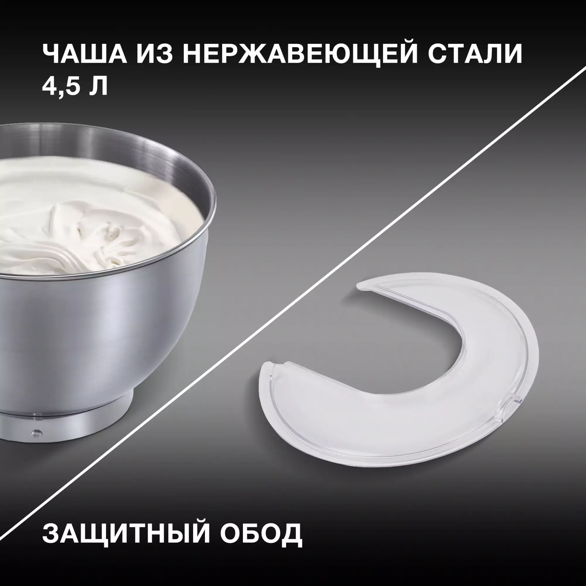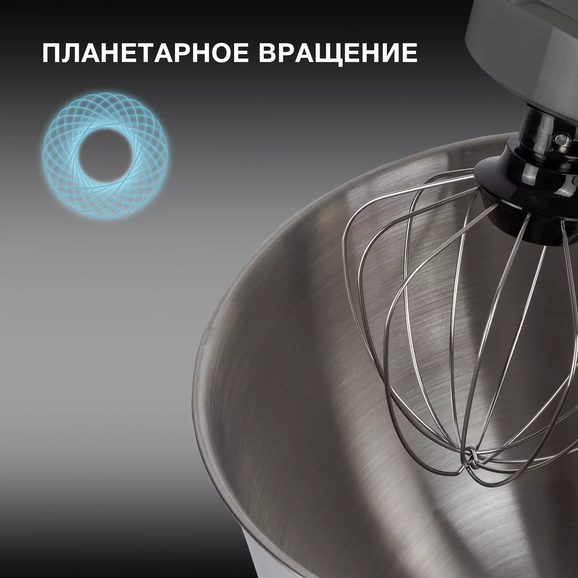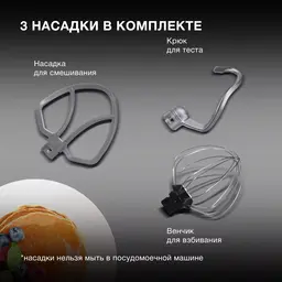 • Комплектация Планетарный миксер; чаша; защитная крышка; насадка-венчик; насадка-крюк; насадка-лопатка; кулинарная силиконовая лопатка; сепаратор для яиц; руководство пользователя с гаратийным талоном; книга рецептов