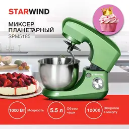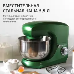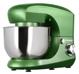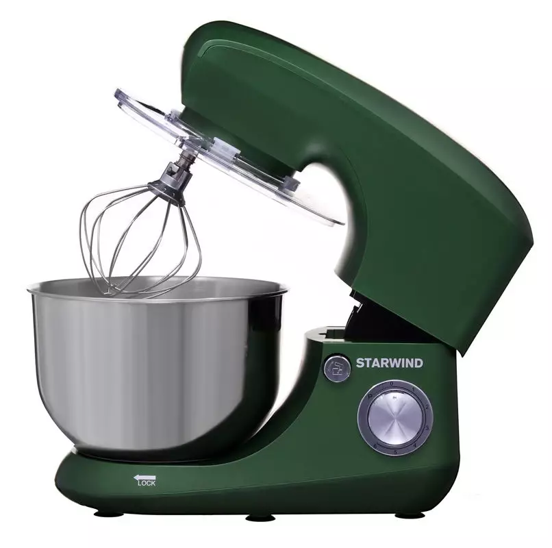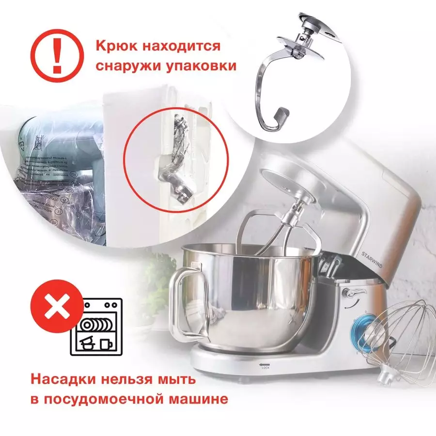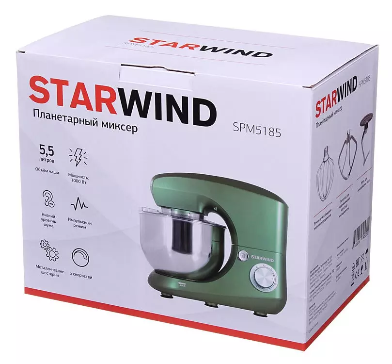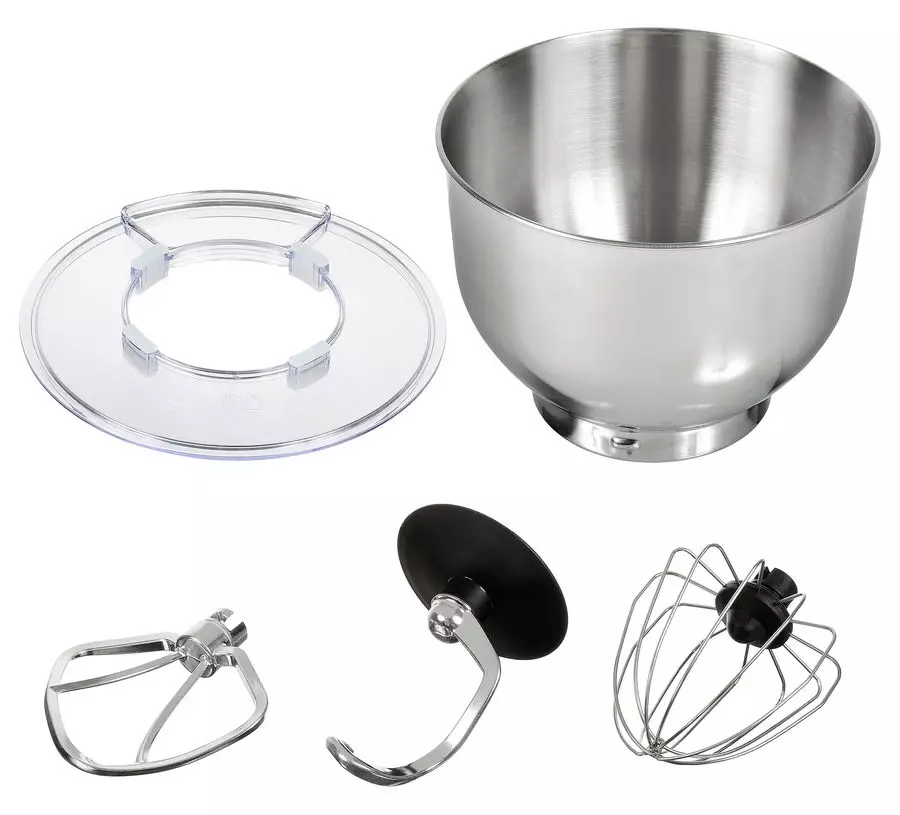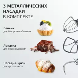 КомплектацияМиксер. Чаша (5,5л). Щиток пластиковый. Лопатка для перемешивания. Крюк для замешивания теста. Венчик для взбивания. Гарантийный талон. Руководство пользователя.