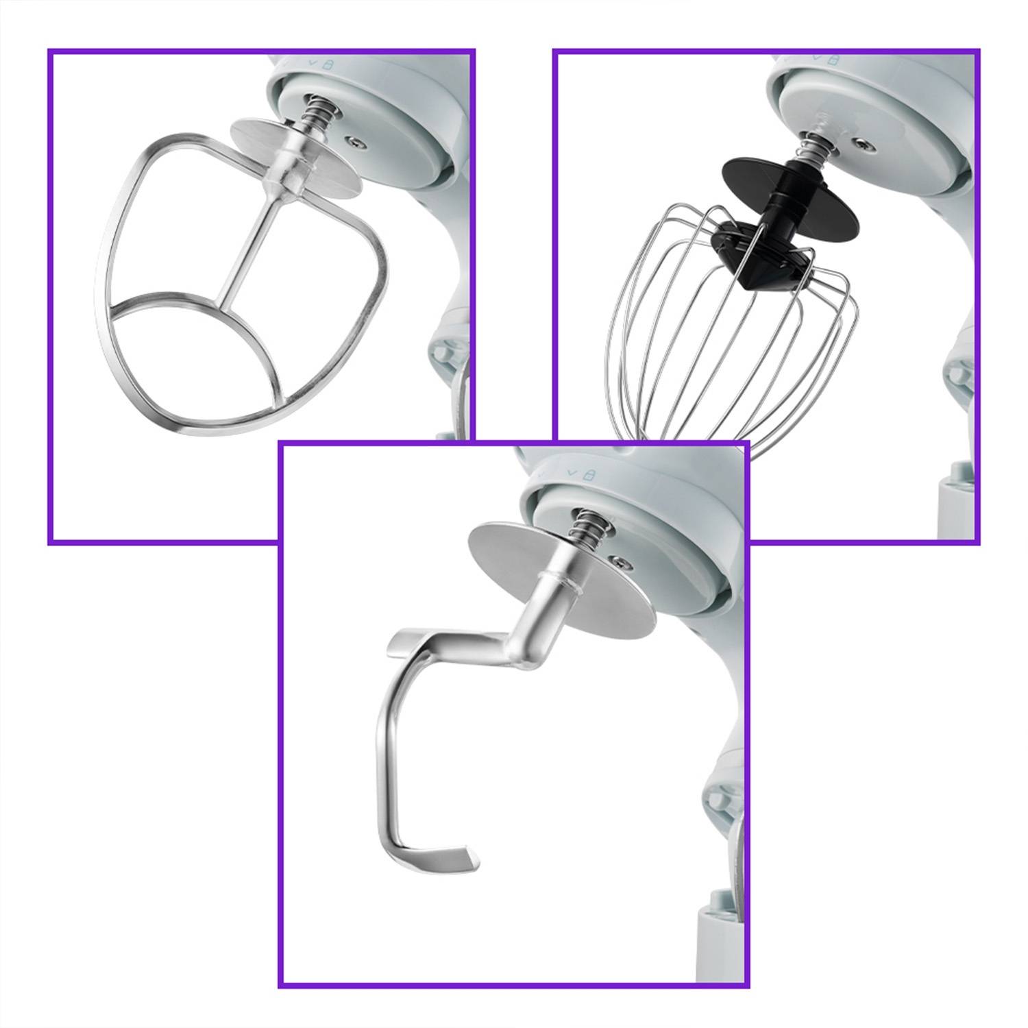 КомплектацияПланетарный миксер (моторный блок, чаша миксера, крышка чаши), венчик для взбивания, насадка для смешивания, крюк для замешивания, руководство по эксплуатации, коллекционный магнит* (*опционально)