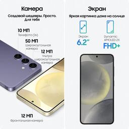 Смартфон Samsung Galaxy S24 5G – это представитель флагманской линейки 2024 года, который открывает доступ к новейшим технологиям. Здесь установлен один из мощнейших процессоров в мире, размещён экран с фантастической контрастностью и расположена камера с тремя объективами.</p> <p><strong>Качественный экран</strong></p> <p>Смартфон с экраном 6,2 дюйма будет удобно лежать в руке, а разрешение FullHD+ (2340x1080 пикселей) обеспечит детализацию картинки. Технология матрицы Dynamic AMOLED 2X передаёт более 16 миллионов различных цветов, а частота обновления 120 Гц обеспечивает плавность смены кадров.</p> <p><strong>Мощный процессор</strong></p> <p>10-ядерный процессор Samsung Exynos 2400 имеет большой запас мощности и ещё много лет будет поддерживать любые современные приложения. Оперативная память в 8 Гб и сможет хранить большой объём необходимых процессору данных, позволяя пользователю, к примеру, непрерывно работать в режиме многозадачности.</p> <p><strong>Функциональная камера</strong></p> <p>Задняя камера состоит из трёх модулей. Широкоугольный объектив разрешением 50 Мп отвечает за детализацию изображения. Сверхширокоугольная камера на 12 Мп спасёт при съёмке большого объекта с близкого расстояния. Телеобъектив разрешением 10 Мп предлагает трёхкратный оптический зум. Цифровые настройки помогут при съёмке в сложных условиях.