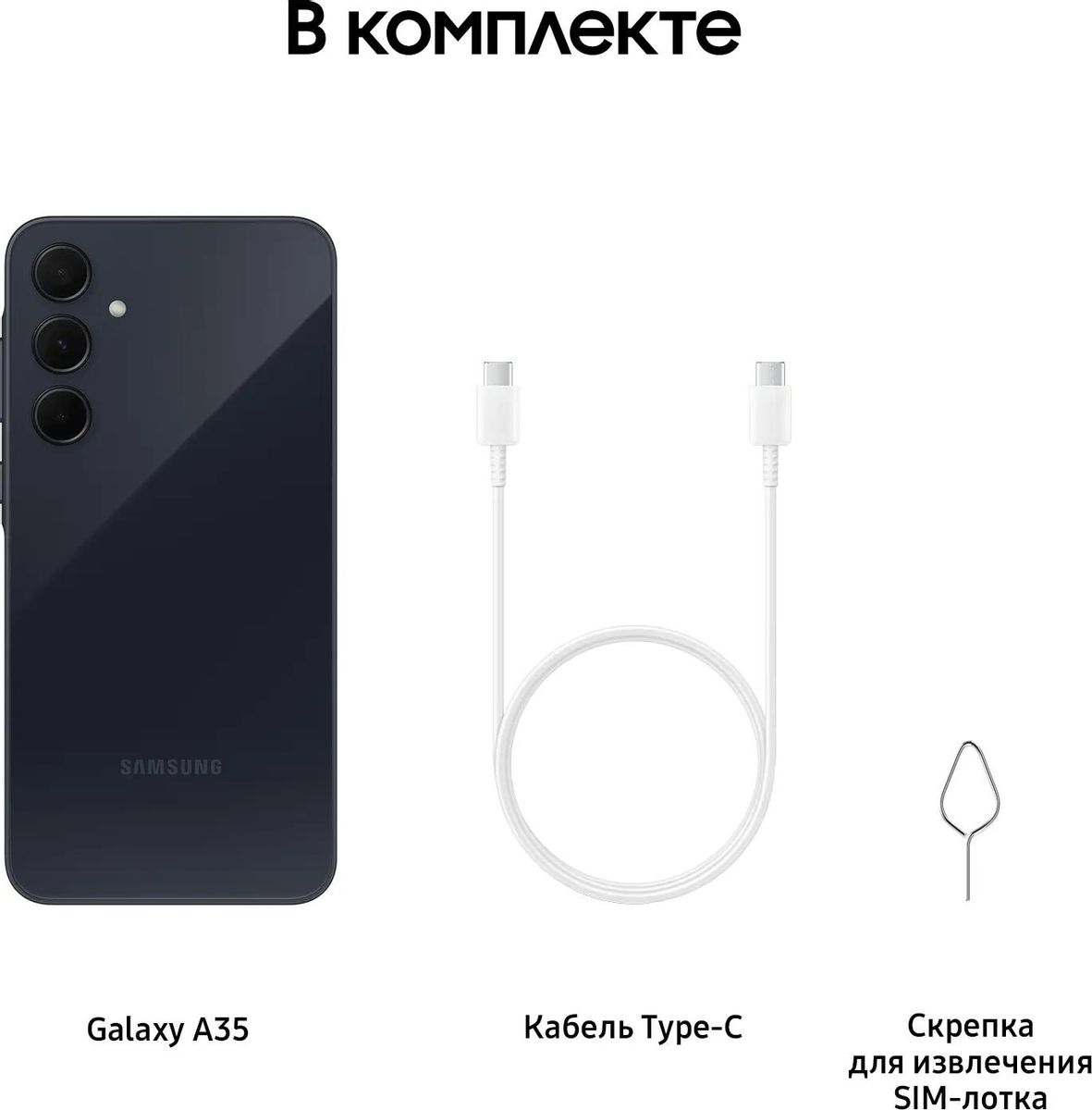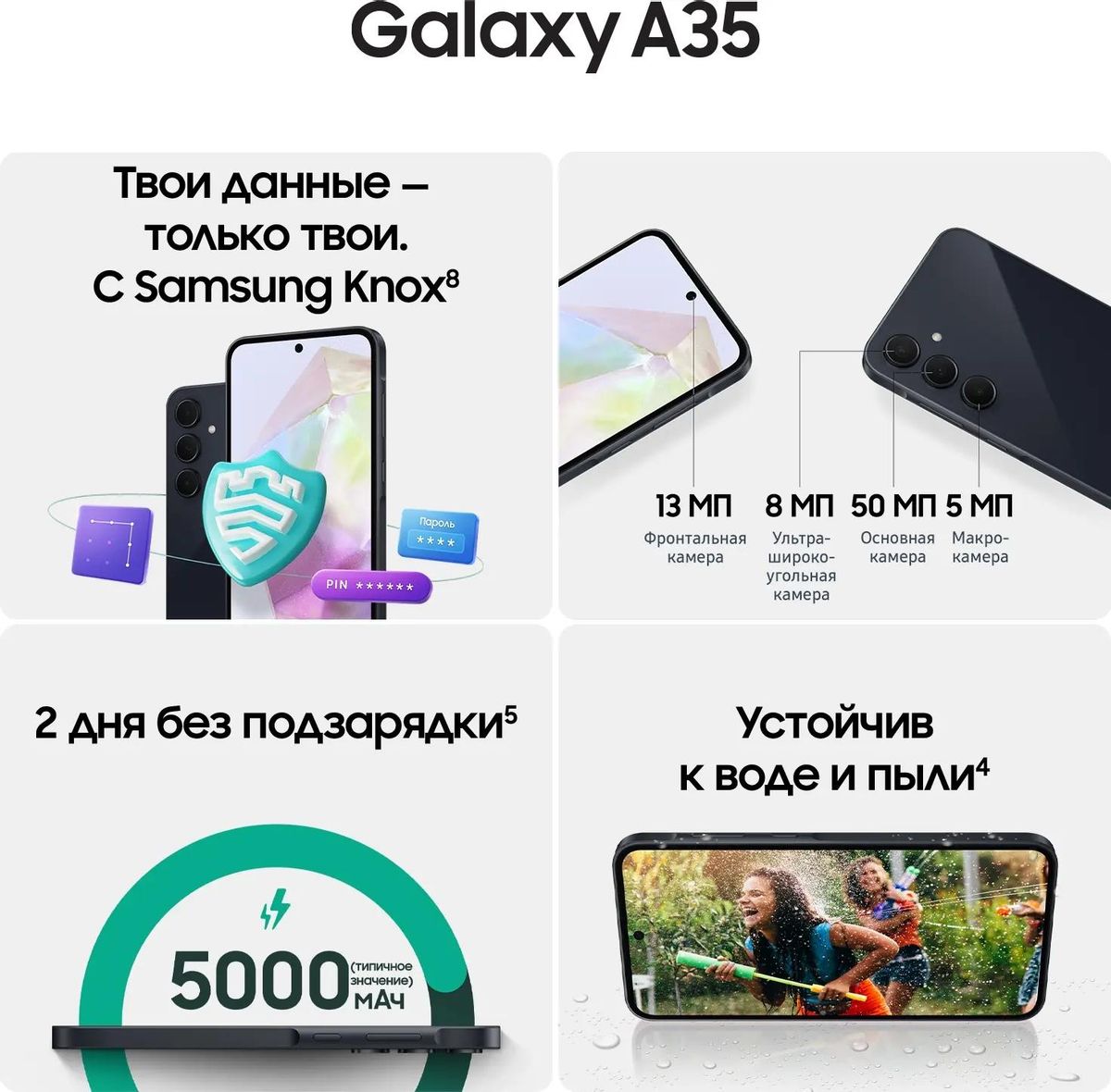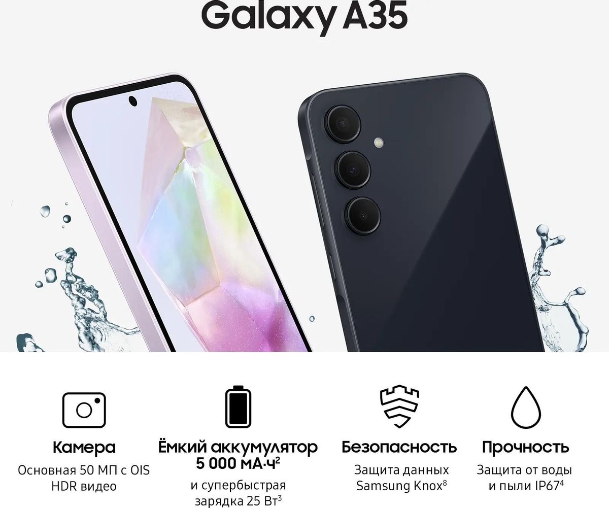 Смартфон Samsung Galaxy A35 5G – это модель 2024 года, которая соответствует требованиям современного пользователя. Экран имеет высокую частоту обновления, процессор справляется с подавляющим большинством задач, а камера может делать качественные снимки с любого расстояния.</p> <p><strong>Контрастное изображение</strong></p> <p>Экран имеет комфортную диагональ 6,6 дюймов и высокое разрешение 2340x1080 пикселей. Матрица по технологии Super AMOLED предлагает лучшую контрастность и имеет спектр из 16 миллионов цветов, в том числе глубоких тёмных оттенков. Высокая частота обновления 120 Гц обеспечивает плавность смены кадров.</p> <p><strong>Сбалансированное оснащение</strong></p> <p>Восьмиядерный Samsung Exynos 1380 справится с современными программами, а оперативная память объёмом 8 Гб поможет избежать вылетов в режиме многозадачности. Встроенная память объёмом 128 Гб сможет разместить большое количество приложений и файлов, а самые требовательные пользователи могут установить карту памяти до 1 ТБ.</p> <p><strong>Функциональная камера</strong></p> <p>Тыловая камера имеет три модуля. Широкоугольный объектив на 50 Мп обеспечивает высокую детализацию изображения. Сверхширокоугольный модуль разрешением 8 Мп пригодится при съёмке больших объектов с близкого расстояния, а макрообъектив на 5 Мп поможет запечатлеть мелкие элементы. Поддерживается 10-кратный цифровой зум.
