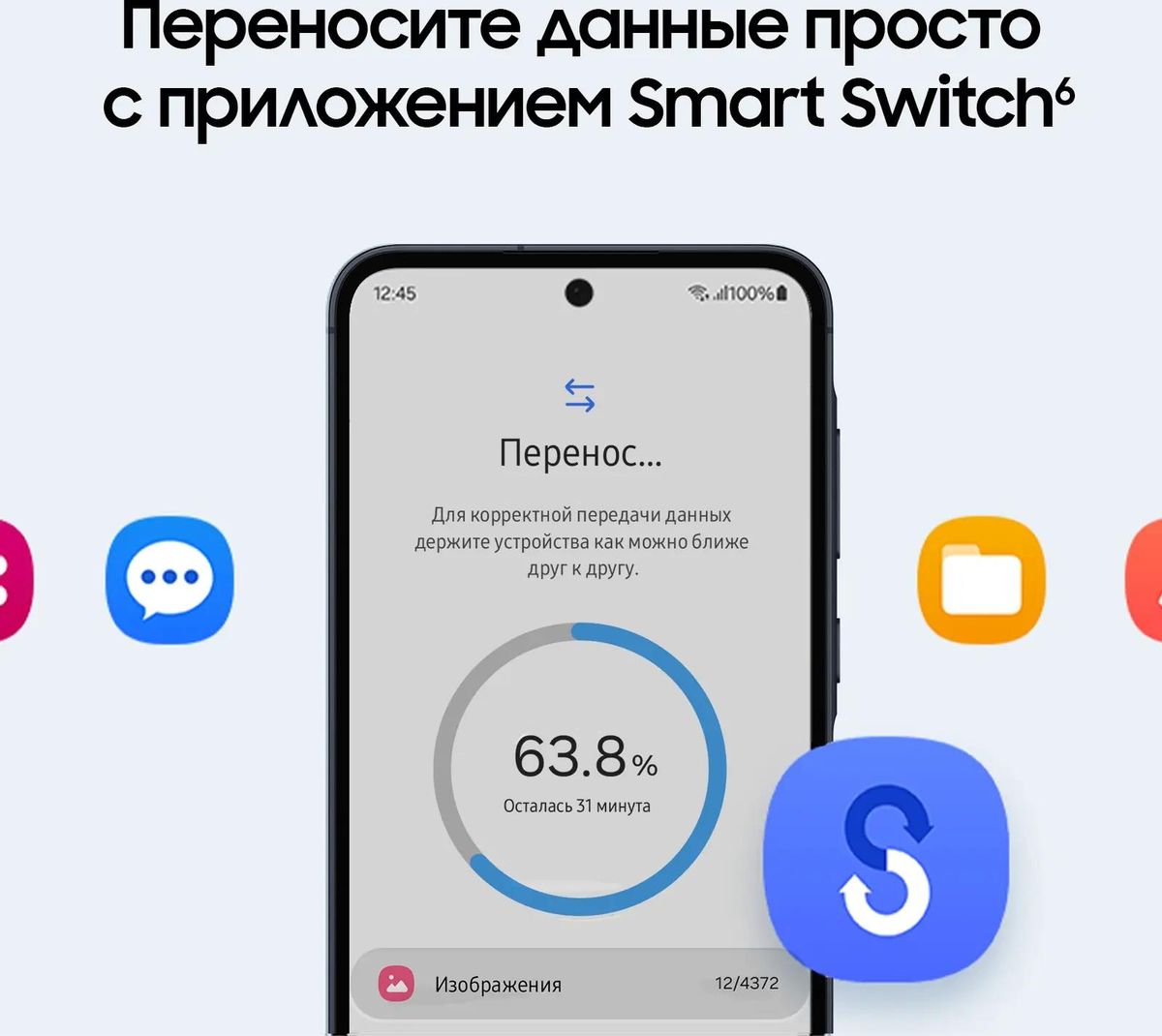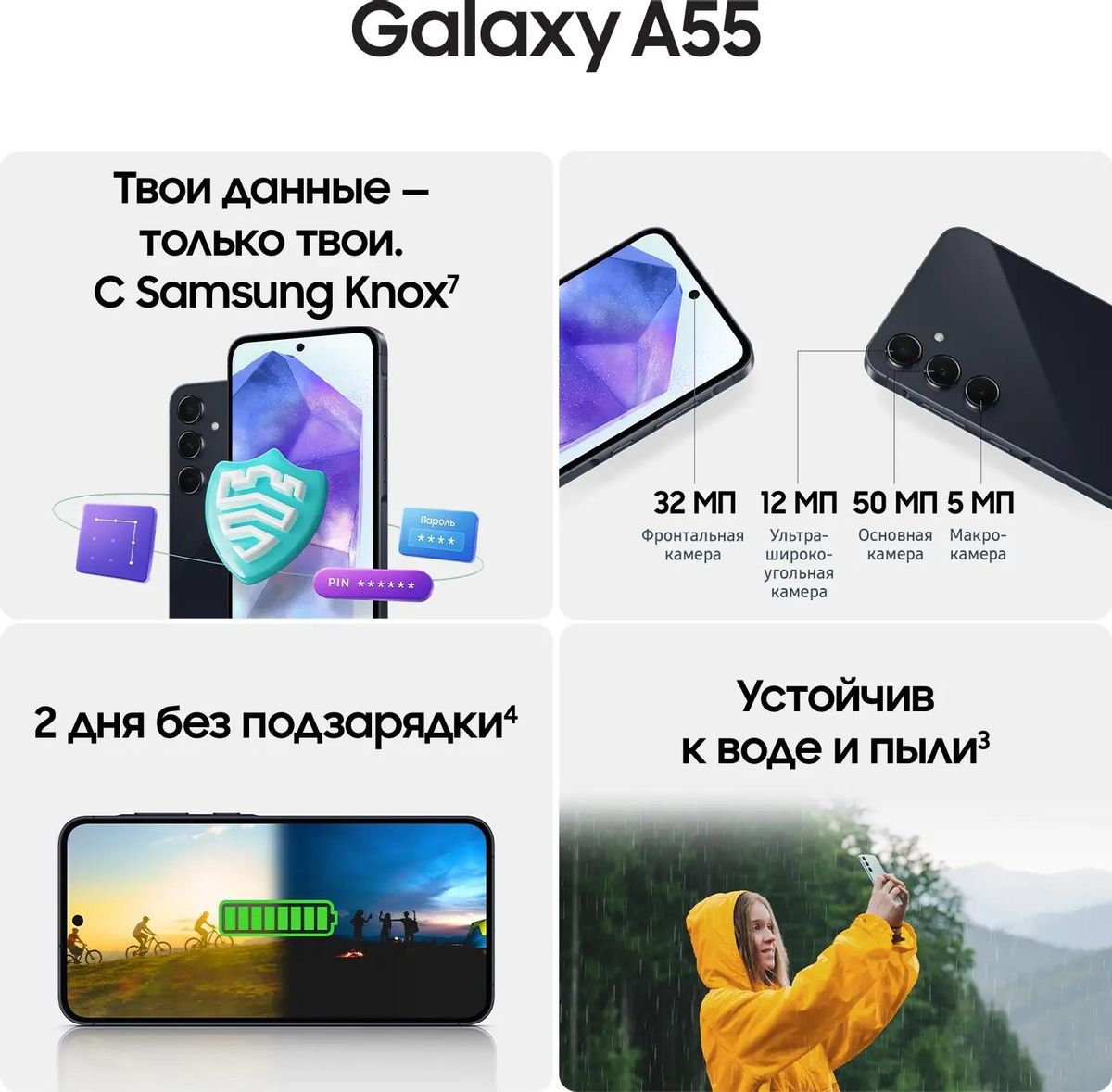 Смартфон Samsung Galaxy A55 5G представлен в 2024 году и имеет современное оснащение. Экран поддерживает высокую герцовку, производительный процессор справится с тяжёлыми приложениями, камера может запечатлеть мельчайшие детали, а предустановленная ОС Android 14 открывает доступ к новейшим функциям.</p> <p><strong>Качественная матрица</strong></p> <p>Экран диагональю 6,6 дюймов отвечает за комфорт для зрения, делая элементы интерфейса крупными и чёткими. Матрица Super AMOLED обеспечивает высокую контрастность и широкий спектр цветов (более 16 миллионов оттенков), а разрешение 2340x1080 точек позволяет смотреть медиафайлы в качестве Full HD+. Частота обновления 120 Гц особенно заметна при динамичной смене кадров, а пиковая яркость 1000 кд/м² позволяет пользоваться гаджетом при ярком свете.</p> <p><strong>Производительное оснащение</strong></p> <p>Восьмиядерный процессор Samsung Exynos 1480 обеспечит поддержку тяжёлых приложений, а ОЗУ на 8 Гб поможет избежать вылетов при переключении в режиме многозадачности. Для постоянного хранения файлов и программ выделено 128 Гб, поддерживаются карты памяти microSD.</p> <p><strong>Три модуля камеры</strong></p> <p>Тройная задняя камера позволяет делать качественные снимки с любого расстояния. Роль основного объектива выполняет широкоугольный модуль разрешением 50 Мп, который обеспечивает высокую детализацию изображений. Сверхширокоугольный объектив на 12 Мп подключается при съёмке крупных объектов с близкого расстояния, а макрообъектив разрешением 5 Мп поможет снять мелкие предметы.