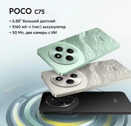 Xiaomi Poco C75 — смартфон с высокоемкой батареей, 8 ГБ оперативной памяти, поддержкой всех базовых проводных и беспроводных интерфейсов. Аккумулятор объемом 5160 мАч позволяет использовать устройство без подзарядки до 139 часов при прослушивании музыки и до 504 часов в режиме ожидания.</p>\n<p>Преимущества Xiaomi Poco C75:</p>\n<ul>\n<li>2 сим-карты формата nano.</li>\n<li>Предусмотрен отдельный слот под карту памяти объемом 1 ТБ.</li>\n<li>Мощный аккумулятор.</li>\n<li>Технология быстрой зарядки.</li>\n</ul>\n<p><strong>Большой экран с высокой частотой кадров</strong></p>\n<p>В Xiaomi Poco C75 установлен большой экран диагональю 6.88 дюйма с разрешением 1640х720 точек и поддержкой 167 млн цветов. Матрица IPS Dot Drop отображает более точные и насыщенные цвета, что особенно важно для профессиональной работы с изображениями и видео. Технология Dot Drop позволяет сократить время отклика пикселей, что делает такие матрицы более подходящими для динамичных сцен – игры и видео.</p>\n<p><strong>Камера с разрешением 50 Мп</strong></p>\n<p>Камера получила широкоугольный объектив 50 Мп с 5 линзами и светодиодной подсветкой для съемки ночью. Камера способна снимать видео в разрешении 1920×1080, режиме HDR, поддерживает портретный режим и таймлапс (замедленную съемку). Автофокусировка самостоятельно настраивает уровень освещения и цветопередачу, позволяет получать высококачественные фото.