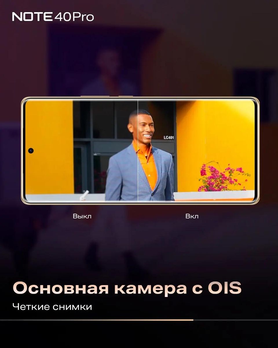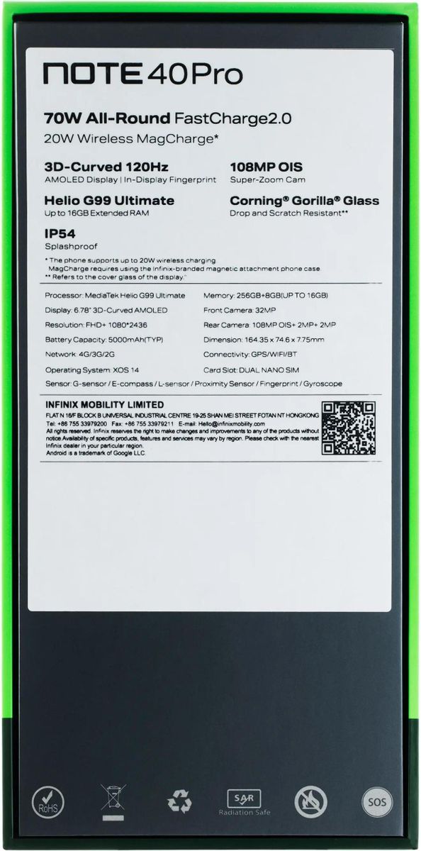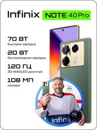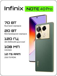 Смартфон INFINIX Note 40 Pro, представленный в 2024 году, соответствует современным требованиям – он имеет экран с высокой частотой обновления, производительное оснащение, качественную камеру и ёмкий аккумулятор.</p> <p><strong>Приятная картинка</strong></p> <p>AMOLED-экран смартфона обеспечивает высокую контрастность, что позволяет передавать глубокие и насыщенные оттенки. В цветовом диапазоне матрицы более миллиона оттенков. Диагональ 6,78 дюймов обеспечивает крупный размер текста и изображений, а частота обновления 120 Гц отвечает за плавность анимации и комфорт для зрения.</p> <p><strong>Поддержка приложений</strong></p> <p>Смартфон работает под управлением восьмиядерного процессора MediaTek Helio G99 Ultimate, который справится с повседневными задачами. Оперативная память объёмом 12 Гб обеспечивает быстрый доступ к данным и помогает избегать зависаний. На момент выхода на смартфон устанавливается последняя версия операционной системы Android 14.</p> <p><strong>Детализированные снимки</strong></p> <p>Основная камера имеет разрешение 108 Мп – это широкоугольный объектив, который обеспечивает впечатляющую детализацию снимков. Ему помогают два дополнительных модуля, которые пригодятся, к примеру, при съёмке в портретном режиме с эффектом глубины. Возможен трёхкратный оптический зум.</p> <p><strong>Долгое время работы</strong></p> <p>Аккумулятор имеет ёмкость 5000 мАч, которая обеспечивает более 10 часов при непрерывном просмотре видео. Быстрая зарядка производится через порт USB Type-C или беспроводным способом по стандарту Qi.