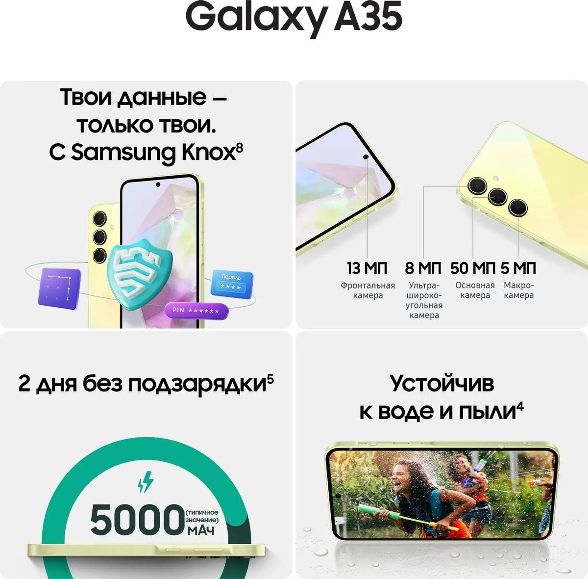 Смартфон Samsung Galaxy A35 5G – это модель 2024 года, которая соответствует требованиям современного пользователя. Экран имеет высокую частоту обновления, процессор справляется с подавляющим большинством задач, а камера может делать качественные снимки с любого расстояния.</p> <p><strong>Контрастное изображение</strong></p> <p>Экран имеет комфортную диагональ 6,6 дюймов и высокое разрешение 2340x1080 пикселей. Матрица по технологии Super AMOLED предлагает лучшую контрастность и имеет спектр из 16 миллионов цветов, в том числе глубоких тёмных оттенков. Высокая частота обновления 120 Гц обеспечивает плавность смены кадров.</p> <p><strong>Сбалансированное оснащение</strong></p> <p>Восьмиядерный Samsung Exynos 1380 справится с современными программами, а оперативная память объёмом 8 Гб поможет избежать вылетов в режиме многозадачности. Встроенная память объёмом 256 Гб сможет разместить большое количество приложений и файлов, а самые требовательные пользователи могут установить карту памяти до 1 ТБ.</p> <p><strong>Функциональная камера</strong></p> <p>Тыловая камера имеет три модуля. Широкоугольный объектив на 50 Мп обеспечивает высокую детализацию изображения. Сверхширокоугольный модуль разрешением 8 Мп пригодится при съёмке больших объектов с близкого расстояния, а макрообъектив на 5 Мп поможет запечатлеть мелкие элементы. Поддерживается 10-кратный цифровой зум.