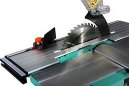 • Комплектация Станок, пильный диск, защитный кожух диска, расклинивающий нож, стол для распиловки, боковые направляющие стола для распиловки 2 шт.,кронштейны жесткости стола для распиловки 2 шт., параллельный упор, крепления параллельного упора 2 шт., шаблон для установки ножей, передвижная каретка для торцевания