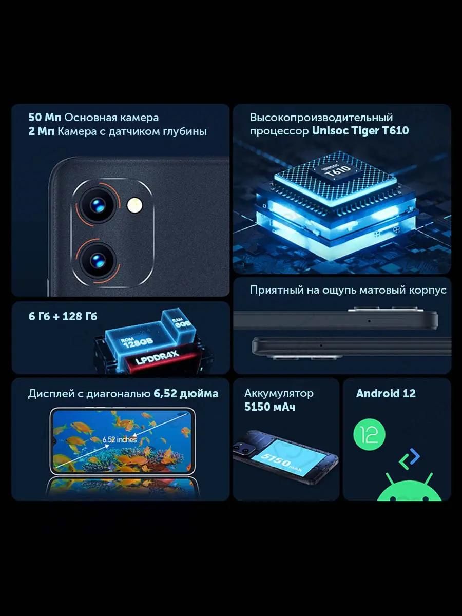Смартфон UMIDIGI G1 Max работает под управлением операционной системы Android 12 на базе восьмиядерного процессора Unisoc с интегрированным графическим ускорителем Mali G52. Сбалансированное сочетание мощного «железа» и обновленного программного обеспечения гарантирует мгновенный запуск приложений и плавную работу в режиме многозадачности. Быстродействие обеспечивают 6 Гб ОЗУ. Этого достаточно для выполнения любых повседневных задач. Для хранения личных данных выделено 128 Гб внутренней памяти, которую при необходимости можно расширить внешней флеш-картой формата microSD.</p> <p><strong>Особенности</strong></p> <ul> <li>подключение к интернету по Wi-Fi;</li> <li>синхронизация с другими устройствами через Bluetooth-соединение;</li> <li>поддержка быстрой зарядки;</li> <li>встроенные системы навигации.</li> </ul> <p>Быстро разблокировать телефон можно с помощью торцевого сканера отпечатка пальца, который встроен в кнопку питания. Также пользователям доступна функция разблокировки по лицу. Данная модель оснащена комбинированным выдвижным лотком, рассчитанным на установку одновременно двух nanoSIM-карт. Однако при использовании карты памяти получится использовать только одну «симку».</p> <p><strong>Дисплей с IPS-матрицей</strong></p> <p>6,52-дюймовый HD-экран с соотношением сторон 20:9 одинаково хорошо подходит для общения в соцсетях, чтения электронной книги и просмотра видеороликов на YouTube. Также можно поиграть в нетребовательные мобильные игры. Дисплей отличается точной цветопередачей и оптимальным уровнем контрастности.</p> <p><strong>Двойная камера</strong></p> <p>Основной 50-мегапиксельный объектив с автофокусировкой и интеллектуальными алгоритмами оптимизации позволяет делать качественные и четкие фотографии в любых условиях освещения. Дополнительная оптика с разрешением 2 Мп предназначена для портретной съемки с эффектом размытия заднего плана. Фронтальная 8-мегапиксельная камера подходит для селфи-снимков и видеозвонков.</p> <p><strong>Автономность</strong></p> <p>В смартфоне используется несъемный литий-ионный аккумулятор емкостью 5150 мАч, с которым можно смотреть фильмы и играть в игры в течение 7 часов или целые сутки непрерывно слушать любимую музыку.