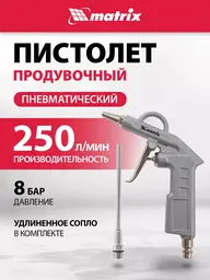 ОписаниеУдлиненное сопло позволяет производить работы в труднодоступных местах. Инструмент предназначен для продувки сжатым воздухом малых отверстий и больших поверхностей.
