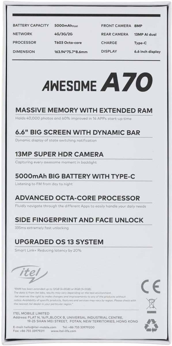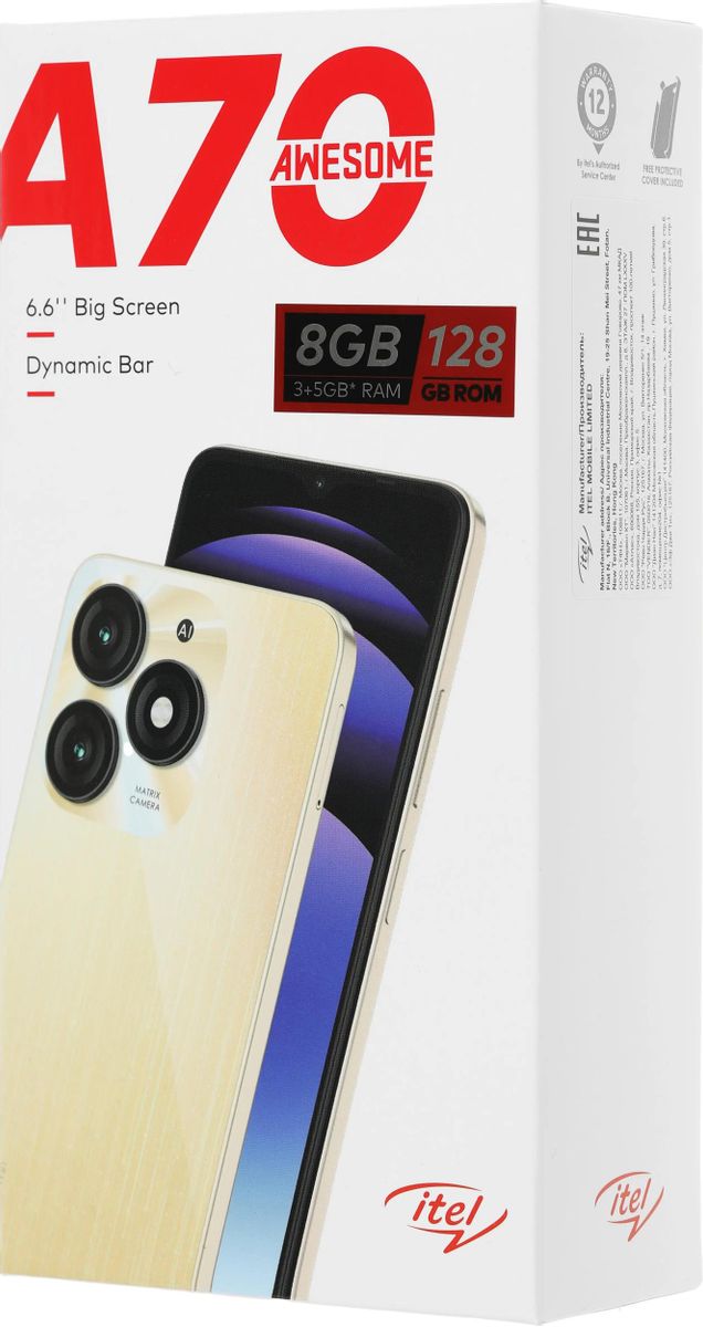 ITEL A70 – бюджетный смартфон с футуристичным дизайном, большим объемом памяти и энергоэффективным аккумулятором, предназначенный для повседневной жизни. На его боковой грани расположен сканер отпечатка пальца, обеспечивающий мгновенную верификацию в системе без ввода сложных цифровых паролей и надежную защиту личной и финансовой информации владельца от постороннего доступа. Устройство поддерживает до двух сим-карт, а также карты памяти формата microSDXC объемом до 2 Тб.</p> <p><strong>Высокая производительность для бытовых задач</strong></p> <p>В смартфоне установлен 8-ядерный процессор Unisoc T603, способствующий быстрому выполнению любых операций – от загрузки соцсетей и веб-страниц до обработки фото и воспроизведения видео. Оперативная память 3 Гб гарантирует плавное и быстрое переключение между несколькими активными приложениями. Встроенная память 128 Гб дает возможность хранения всех важных документов и файлов. Литий-ионный аккумулятор 5000 мАч позволяет общаться, смотреть фильмы и играть в течение всего дня, не беспокоясь о внезапной разрядке с последующим отключением.