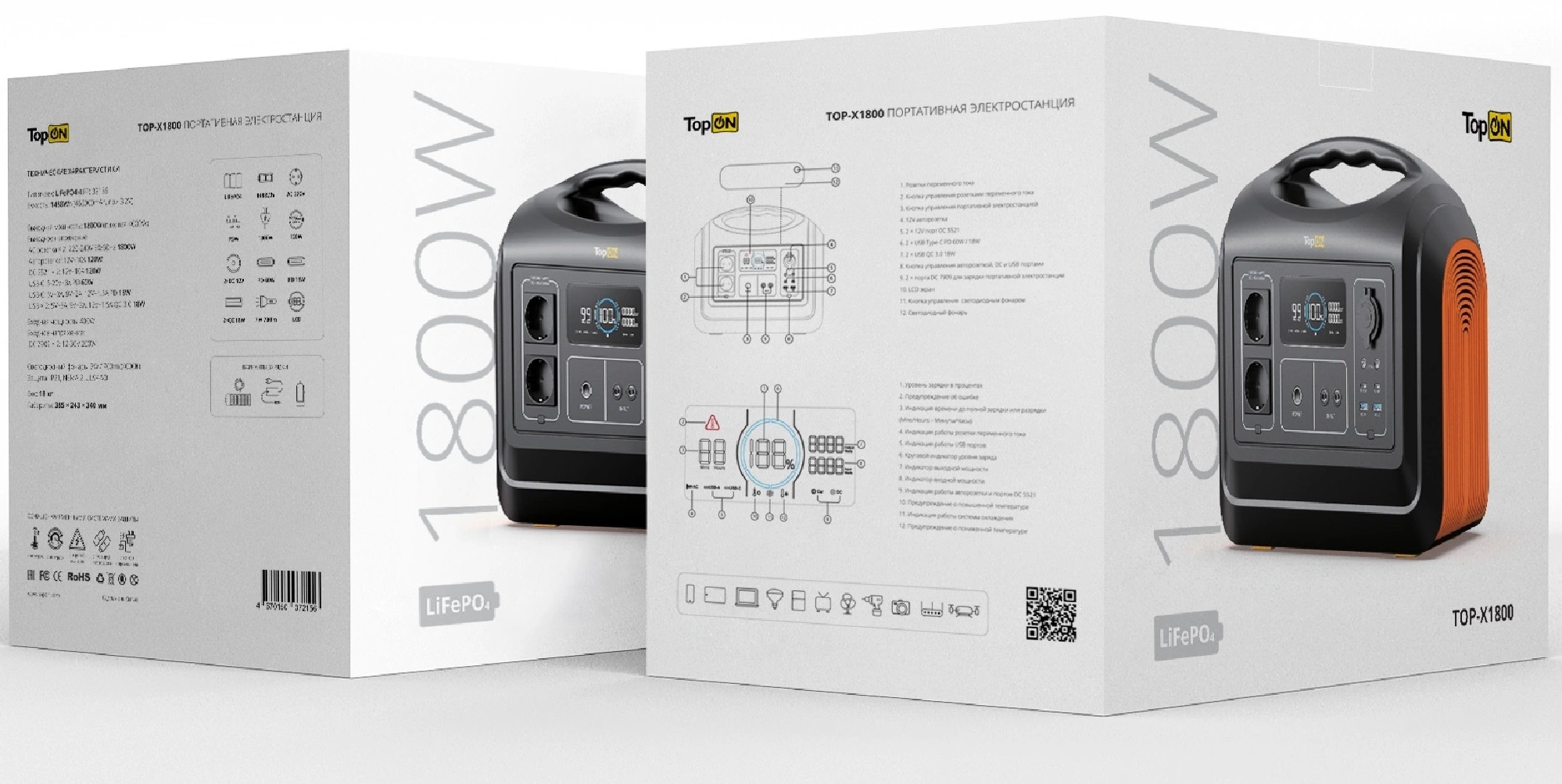 • Описание LiFePO4 ячейки, сохраняющие заряд при отрицательных температурах. Выходная мощность 1800W, пиковая 4000W. 2 розетки переменного тока. Светодиодный фонарь 700 lm. Зарядка от сетевого блока питания, солнечной панели или автомобильной розетки. Корпус из ударопрочного и огнестойкого ABS пластика.