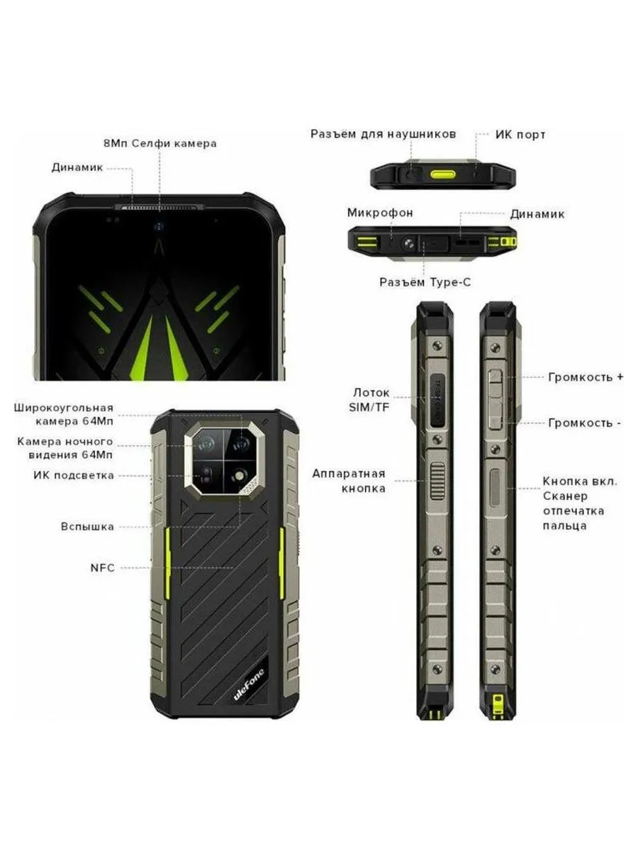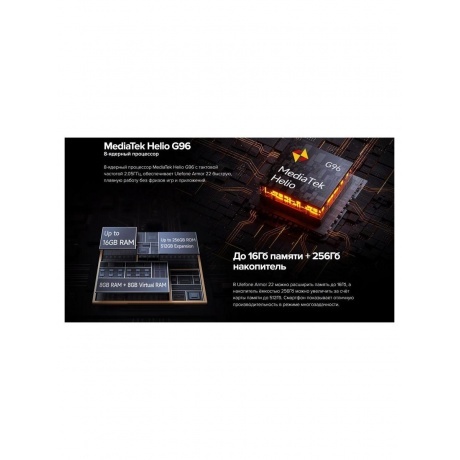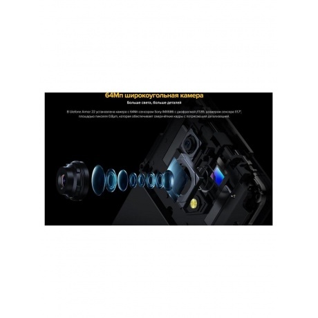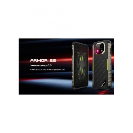 Ulefone Armor 22 в толщину всего 15мм, но обладает защитой. Металлические вставки по бокам с перфорацией обеспечивают надёжный хват. Линзы камера защищает специальная металлическая оправа. Ulefone Armor 22 соответствует стандартам защиты IP68, IP69K и MIL-STD-810H, создан для эксплуатации в самых суровых условиях среды. Будучи защищённым от воздействий влаги, ударов и падений, он отлично подойдёт для промышленной эксплуатации, строительства, транспорта, многодневных походов и различных рабочих профессий. В Ulefone Armor 22 установлен модуль из двух камер: 64Мп широкоугольной и 64Мп ночной камеры. Новые возможности съёмки, ИК-светодиоды, новая вспышка, новый уровень технологий. Мощные ИК светодиоды позволяют снимать в полной темноте. Передовой 64Мп сенсор вкупе с алгоритмом постобработки NightElf Ultra 2.0 минимизируют количество шумов в кадре. В условиях слабого освещения и даже в полной темноте, камера обеспечивает высокодетализированные кадры, позволяет запечатлеть движение в ночном лесу, рассмотреть не затушенный костёр или окурок. В Ulefone Armor 22 установлена 8Мп селфи камера, которая обеспечивает высокодетализированные, резкие кадры, видеозвонки в высоком качестве. Включите режим подводной съёмки, чтобы запечатлеть потрясающие пейзажи под водой. 8-ядерный процессор MediaTek Helio G96 с тактовой частотой 2.05 ГГц, обеспечивает Ulefone Armor 22 быструю, плавную работу без фризов игр и приложений. Ulefone Armor 22 можно использовать в качестве универсального пульта ДУ для ТВ, кондиционеров, любых других устройств, управляемых с помощью ИК пульта. Поддержка всех глобальных диапазонов частот 4G, позволяет Вам путешествовать по всему миру и оставаться на связи в любой стране. Обеспечиваются звонки в HD-качестве и высокая скорость передачи данных.