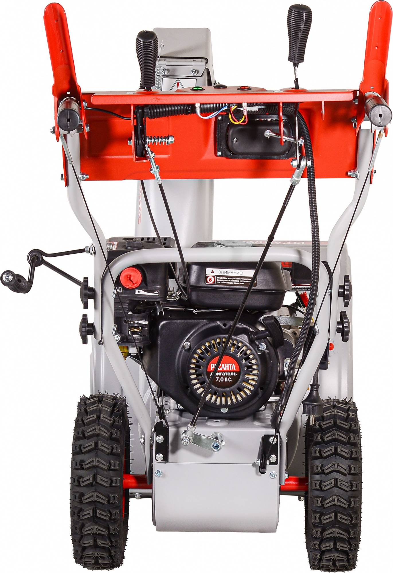 КомплектацияСнегоуборщик в сборе с двигателем, рычаг поворота желоба, ограничительные башмаки - 2 шт., рукоятка управления с панелью в разборе, крепежный комплект, паспорт.