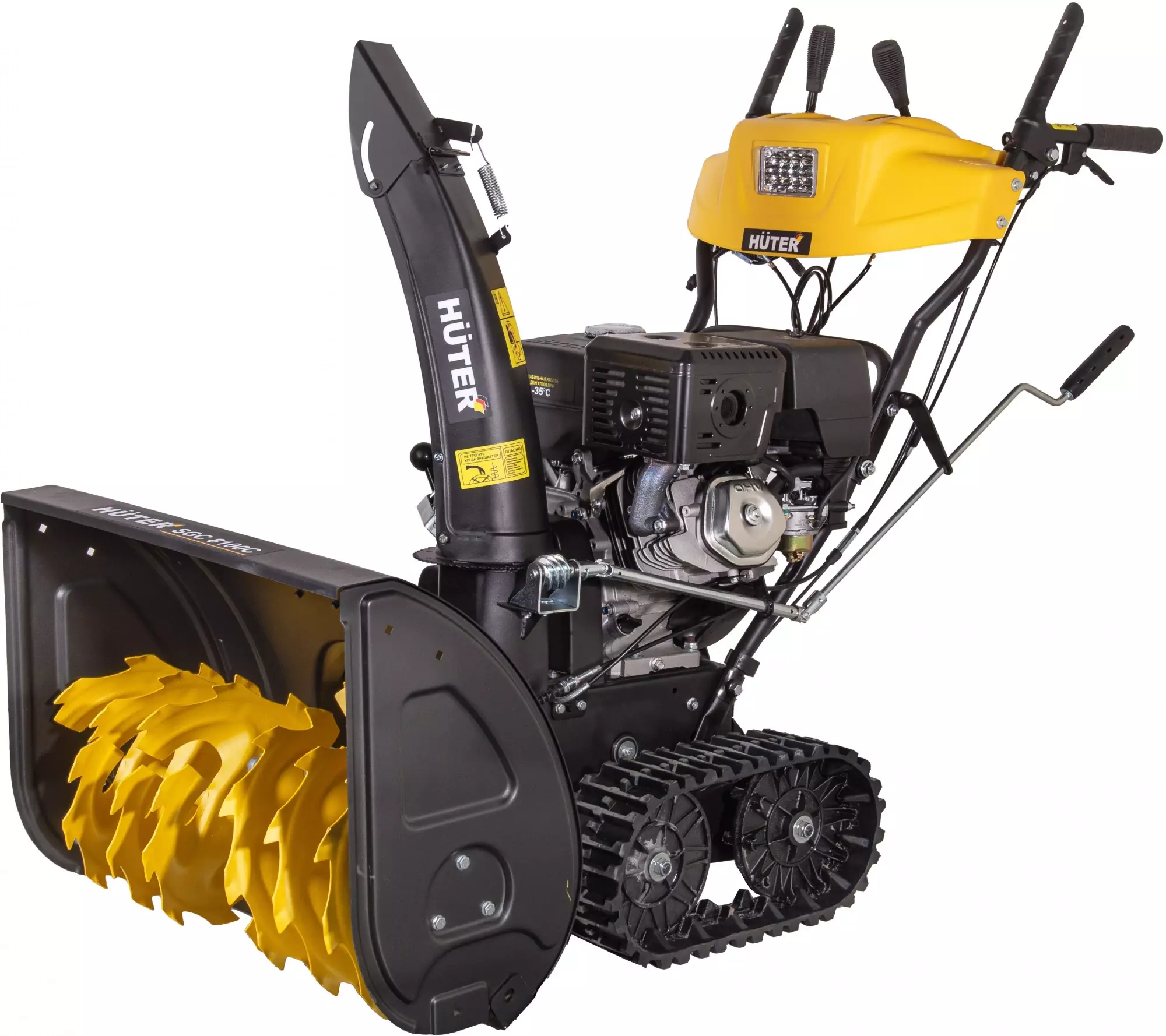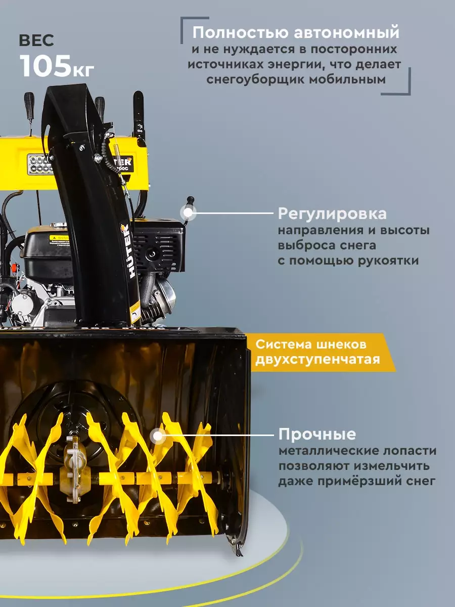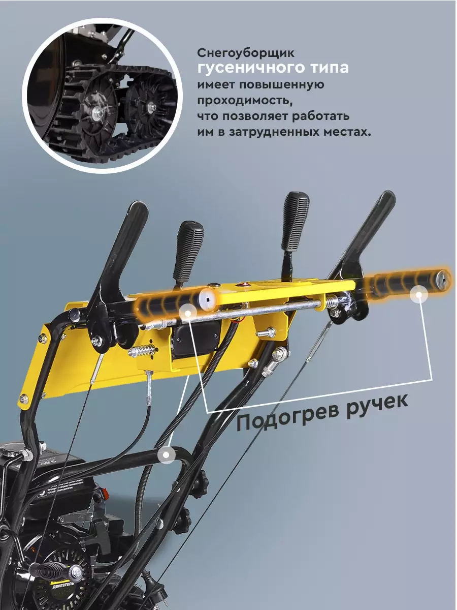 КомплектацияСнегоуборщик в сборе с гусеницами, Рычаг поворота желоба, ограничительные башмаки 2шт, рукоятка управления с панелью в разборе, крепежный комплект, паспорт изделия