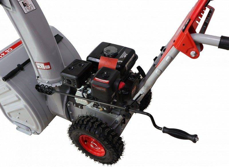 КомплектацияСнегоуборщик в сборе с двигателем, рычаг поворота желоба, ограничительные башмаки - 2 шт., рукоятка управления с панелью в разборе, крепежный комплект, паспорт.