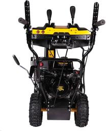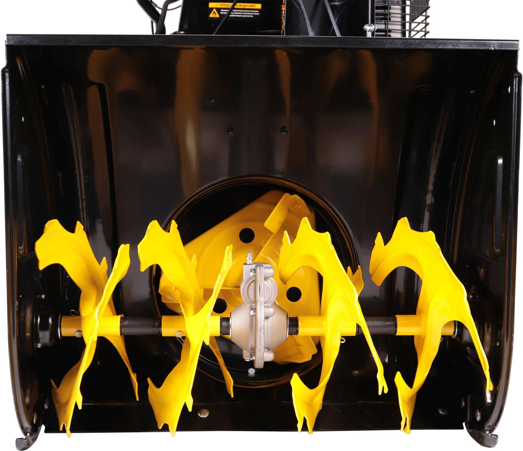 ОсобенностиЭлектростартер, фара, обогрев рукояток. Обрезиненные рукоятки, блокировка рычага включения шнеков. Регулировка положения выброса снега и положения желоба производится на панели.