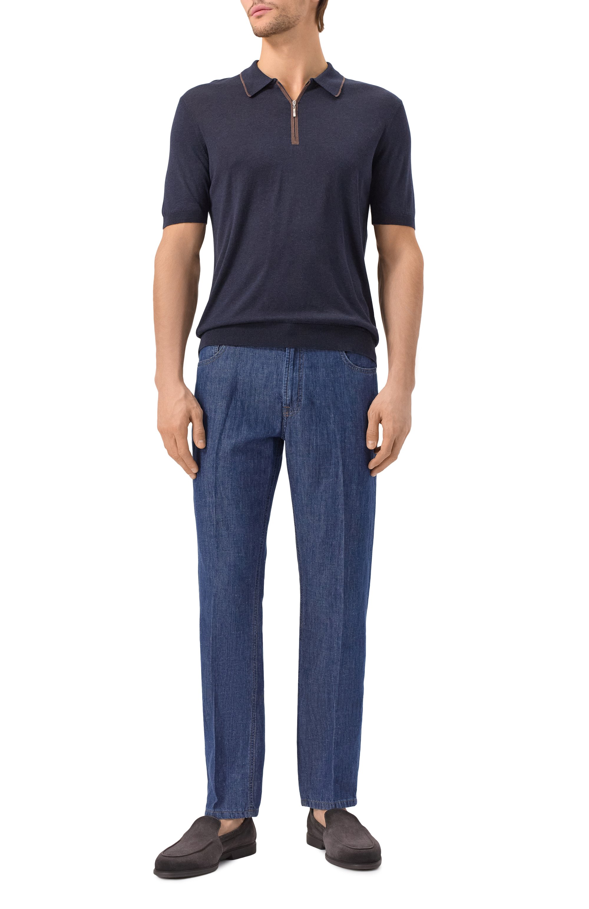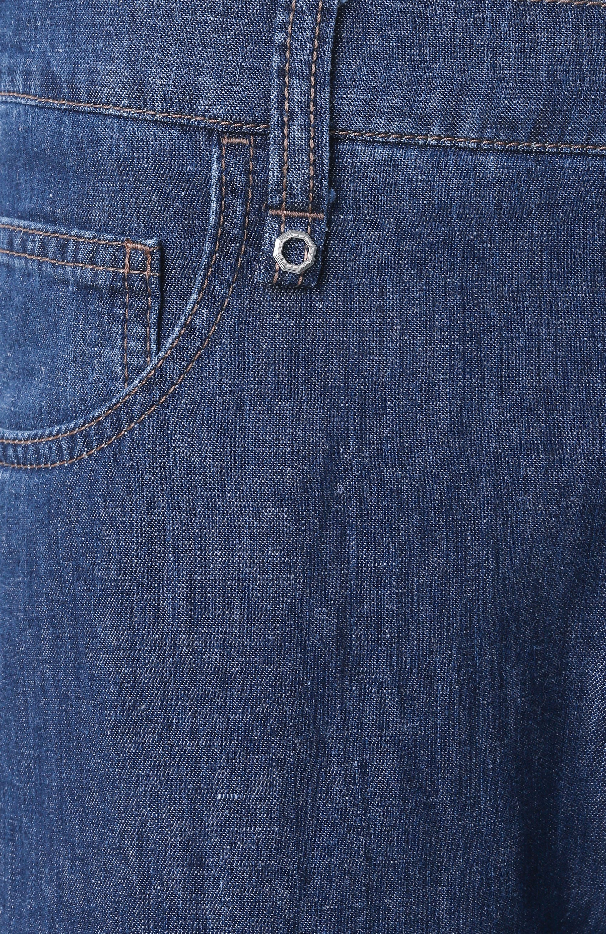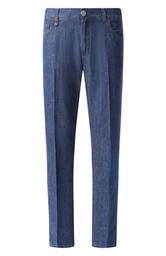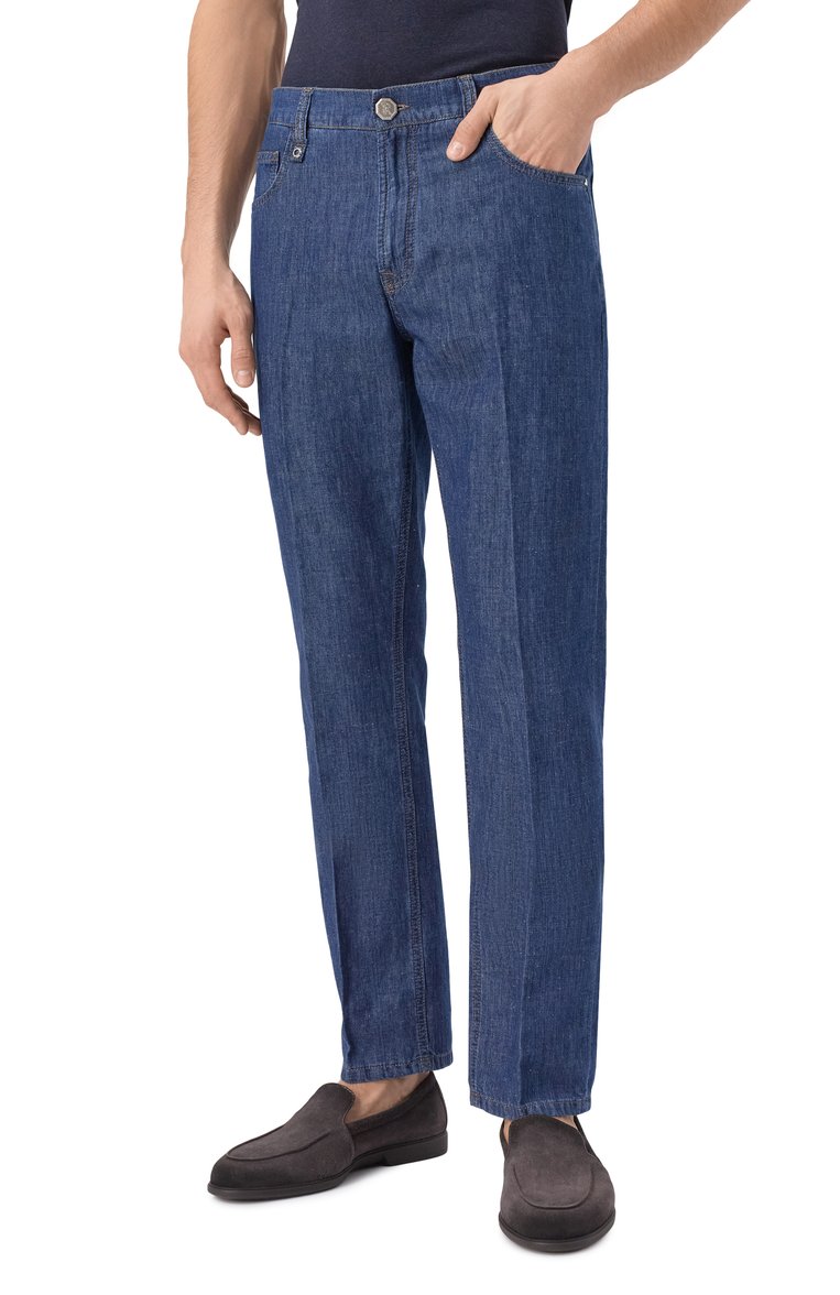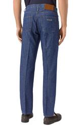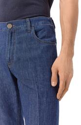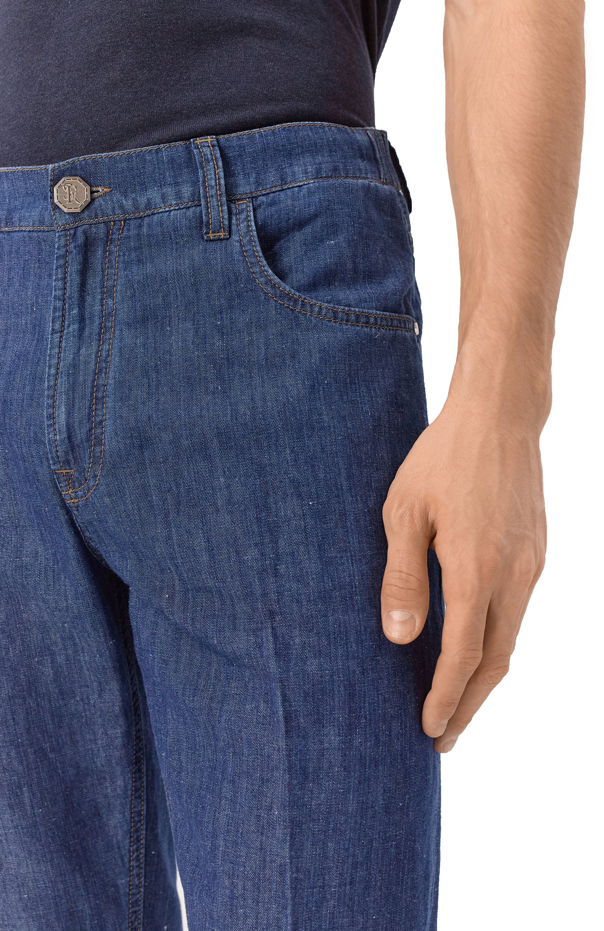 Джинсы со стрелками сшили из хлопкового денима с добавлением льна. Модель с фурнитурой в форме фирменного октагона украсили брендированными патчем на поясе и пластиной с логотипом на одном из пяти карманов.