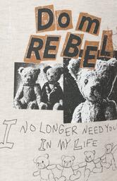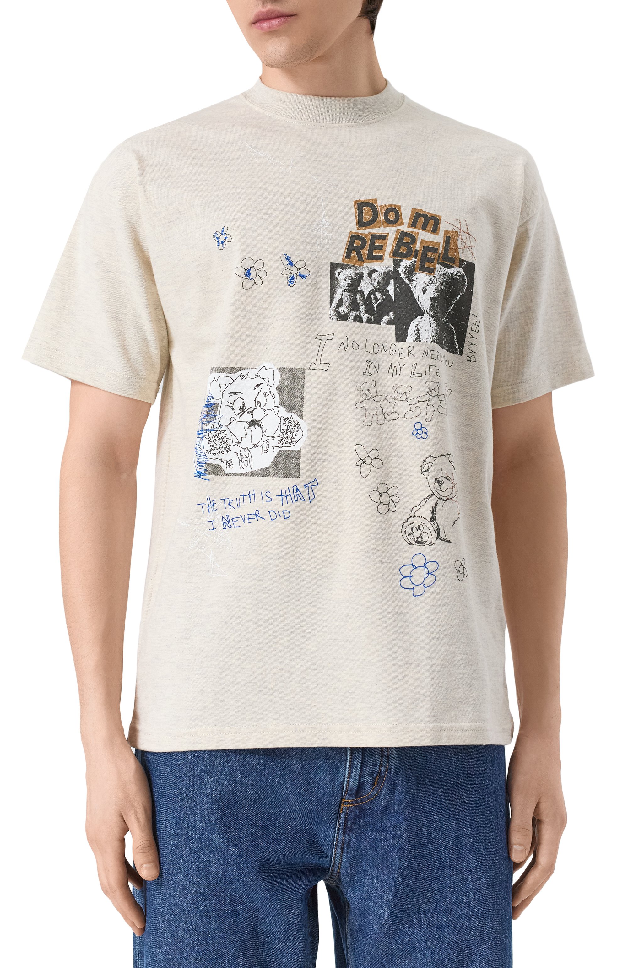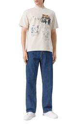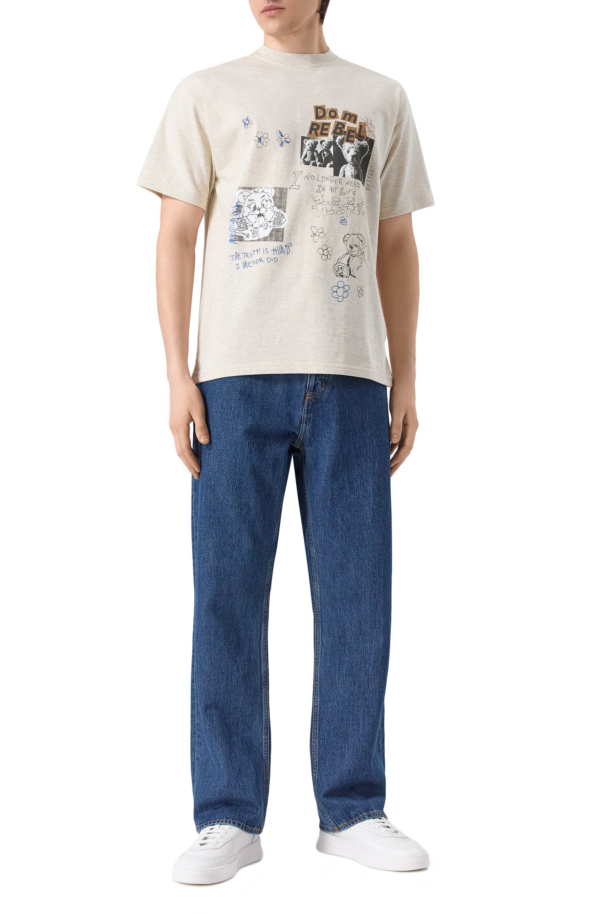 Для создания футболки Stuffy с круглым вырезом использовали хлопковое джерси плотностью 275 г/м2. Модель прямого кроя украсили с двух сторон принтами и вышивкой с фирменными персонажами и надписями.