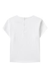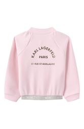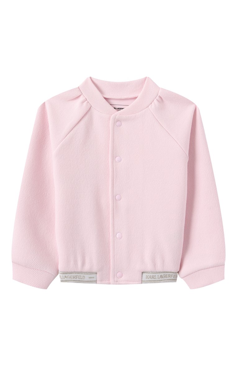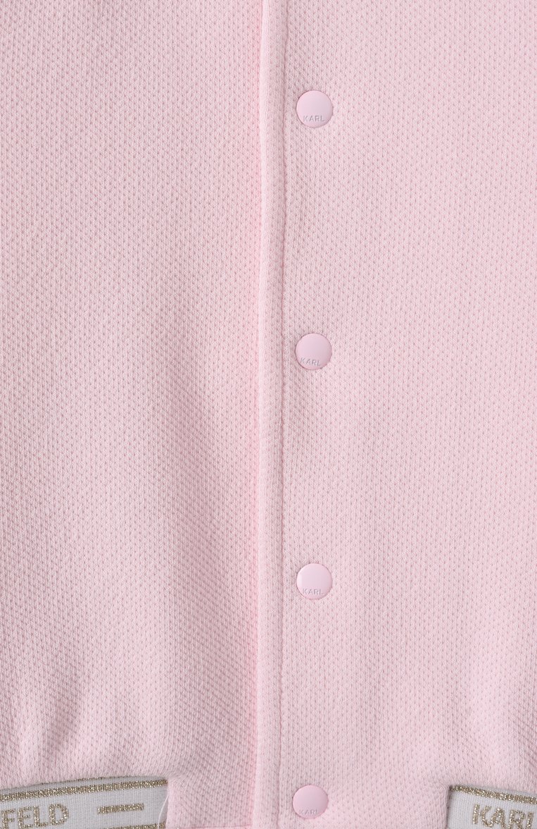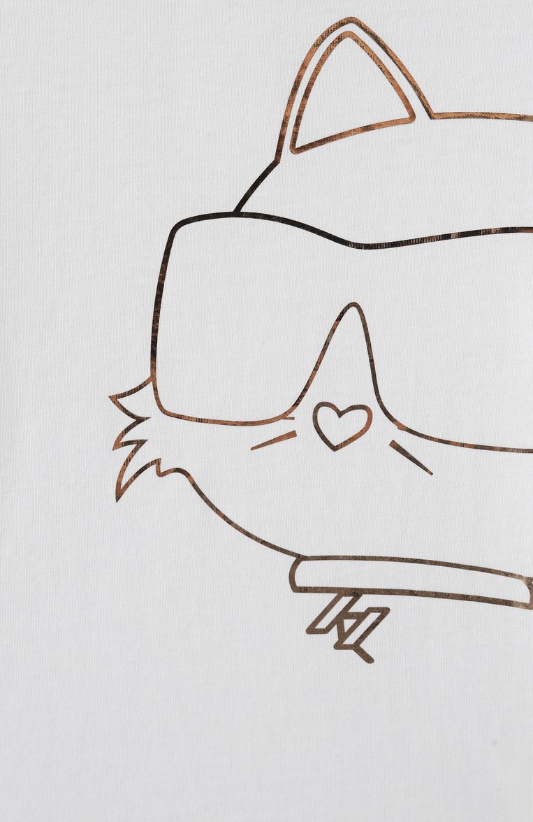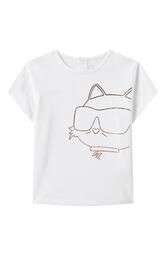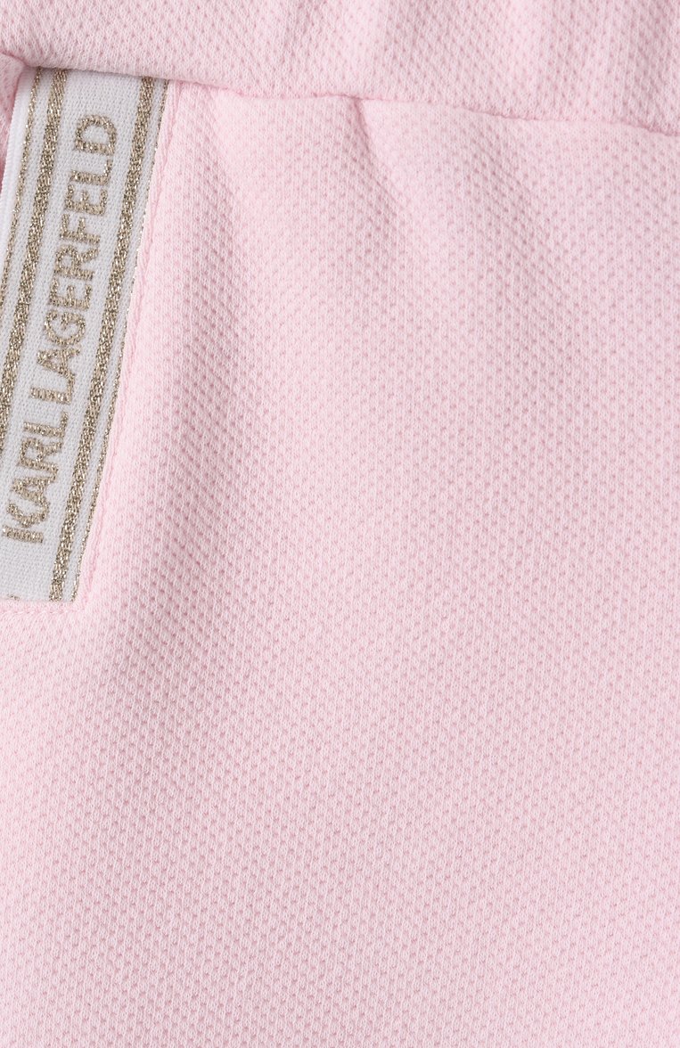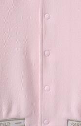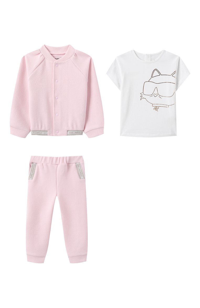 Толстовку с рукавами реглан сшили из хлопкового трикотажа стрейч, усиленного полиэстером. Модель на кнопках, с мерцающим брендированным поясом декорировали сзади блестящим логотипом Rue St-Guillaume. В комплекте – парные джоггеры с боковыми карманами и футболка с кнопками на спинке, сшитая из хлопка джерси и украшенная принтом Ikonik Choupette.