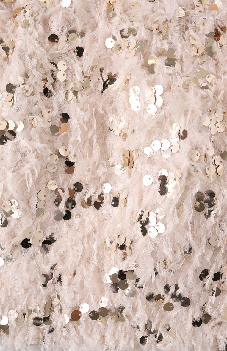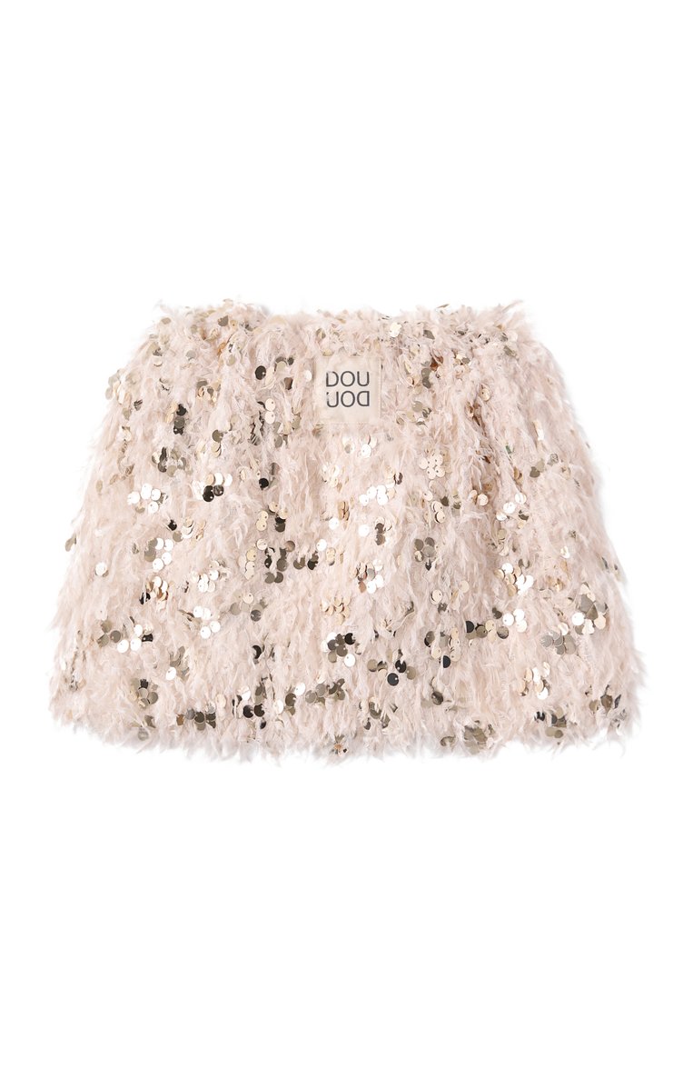 Короткую юбку с хлопковым подкладом выполнили из легкого полиэстера с бахромой, имитирующей перья. Модель, украшенную брендированной нашивкой сзади, расшили крупными золотистыми пайетками.