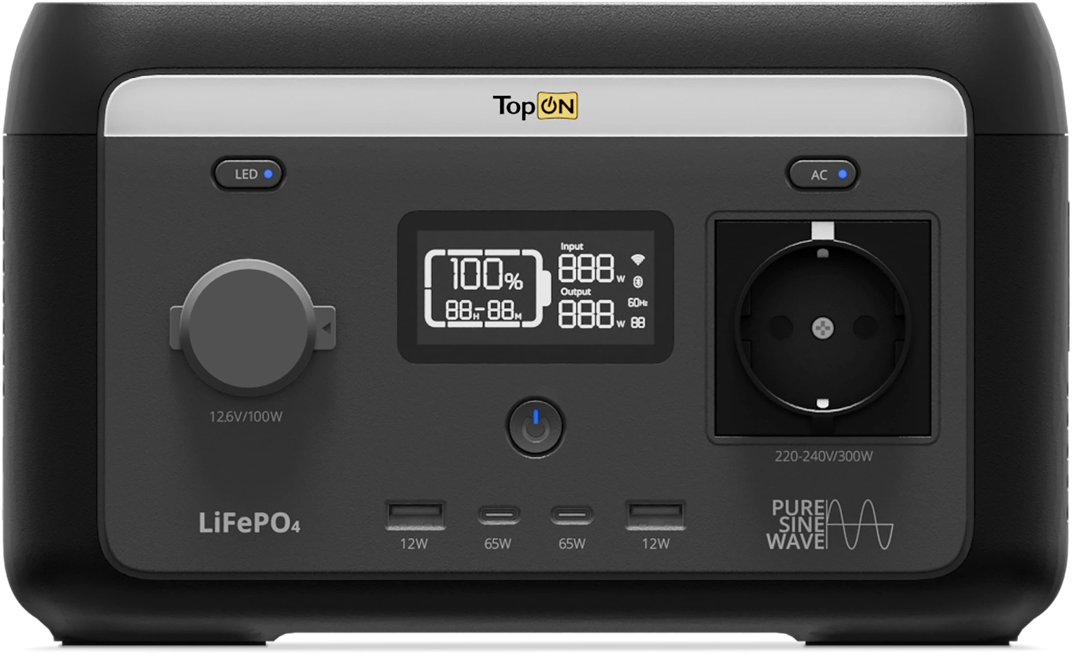 Режимы напряжения и силы токаAC розетка (режим Inverter): 220-240V 50/60Hz 1.5A 300W PSW; AC розетка (режим EPS*): 220-240V 50/60Hz 1.5A 300W; DC авторозетка: 12.6V 8A 100W; USB-C1/C2: 5-15V 3A, 20V 3.25A PD 65W; USB-C1+C2: 5-9V 3A, 12V 2.5A, 15V 2A, 20V 1.5A 60W; USB * 2: 5V 2.4A 12W