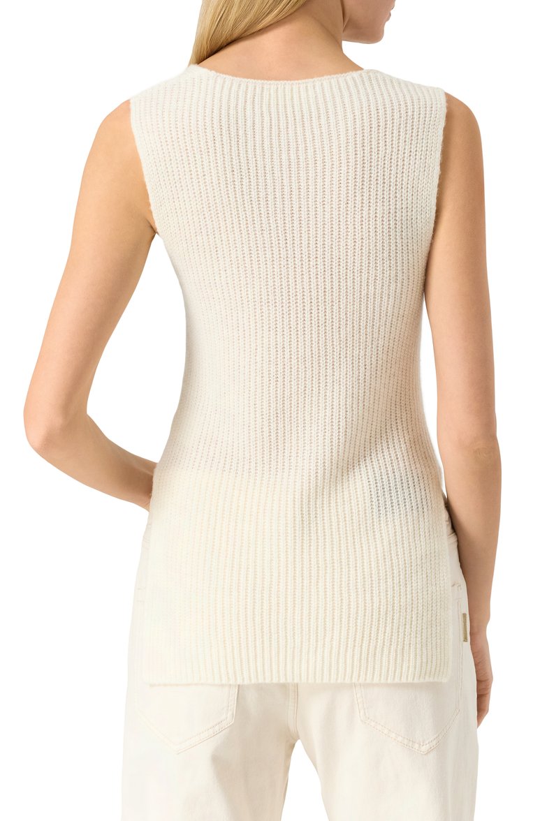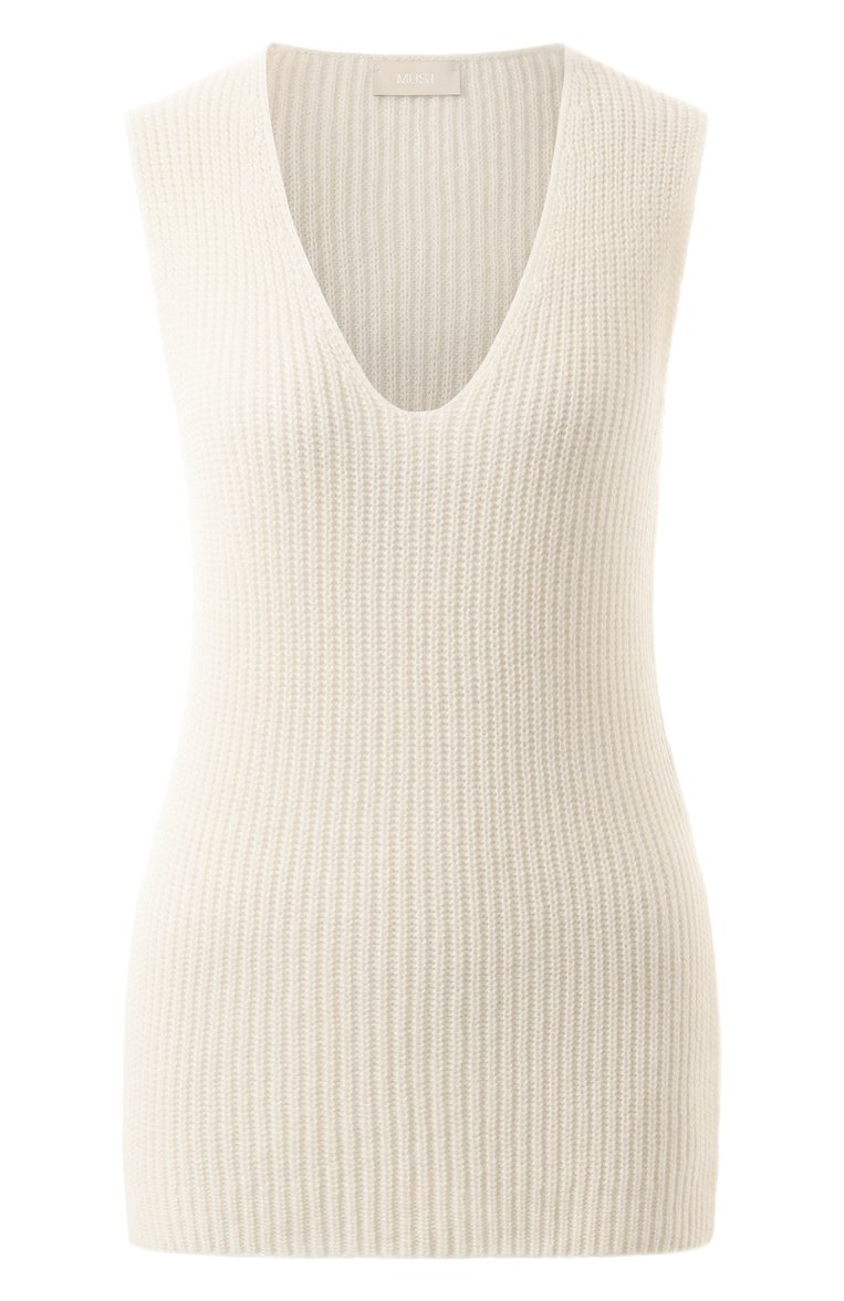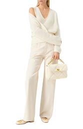 Топ с глубоким V-образным декольте и боковыми разрезами выполнили из микса шерсти, кашемира и шелка. Модель, связанная резинкой, органично впишется в базовый гардероб.