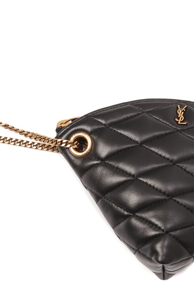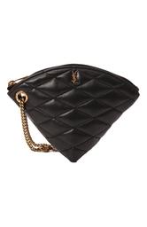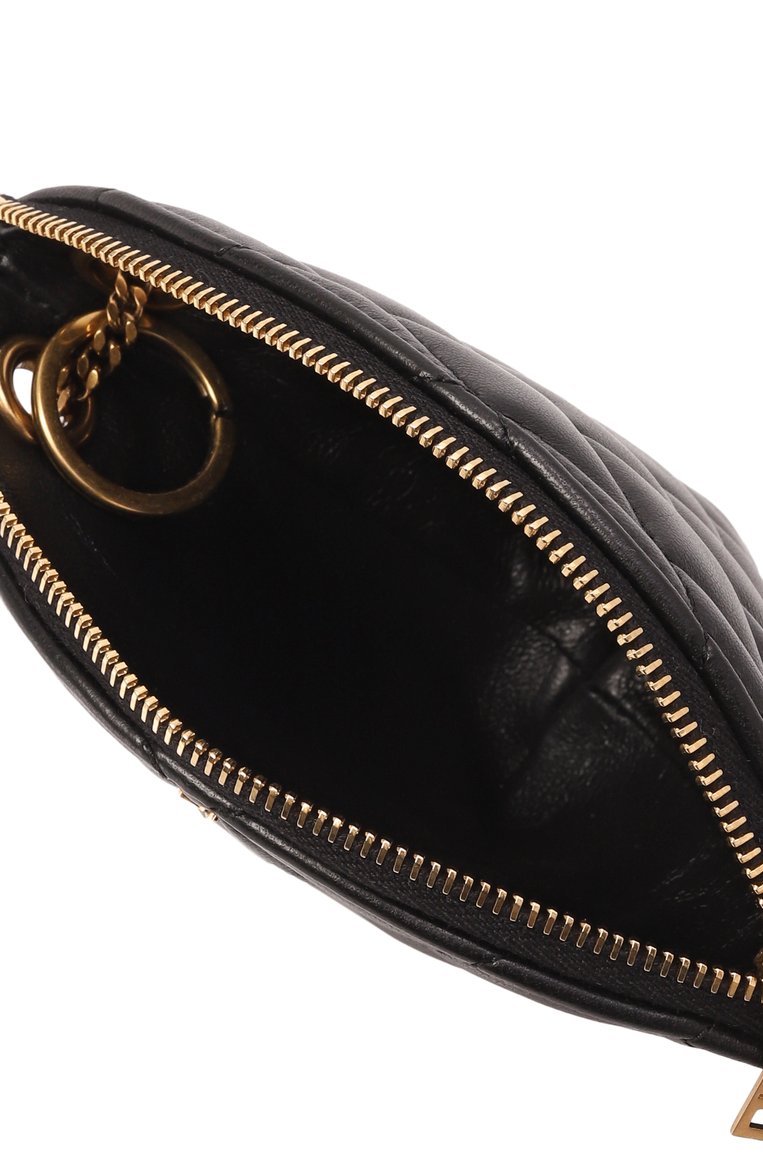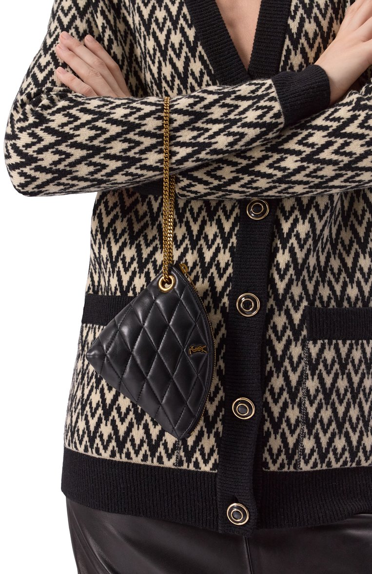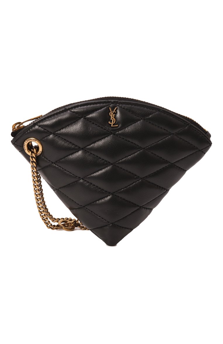 В стеганый узор на треугольном клатче Sade из кожи ягненка вписали монограмму Кассандра. Сквозь брендированные люверсы пропустили съемную ручку-петлю из цепочки. Аксессуар с внутренним кольцом для ключей застегивается молнией.