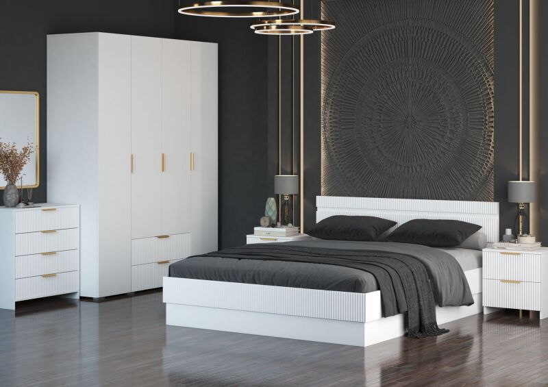 Спальный гарнитур «Вельвет»— простой способ оформить светлый и уютный интерьер с запоминающимися деталями. Тонкие вертикальные линии на матовых фасадах придают мебели элегантный вид.