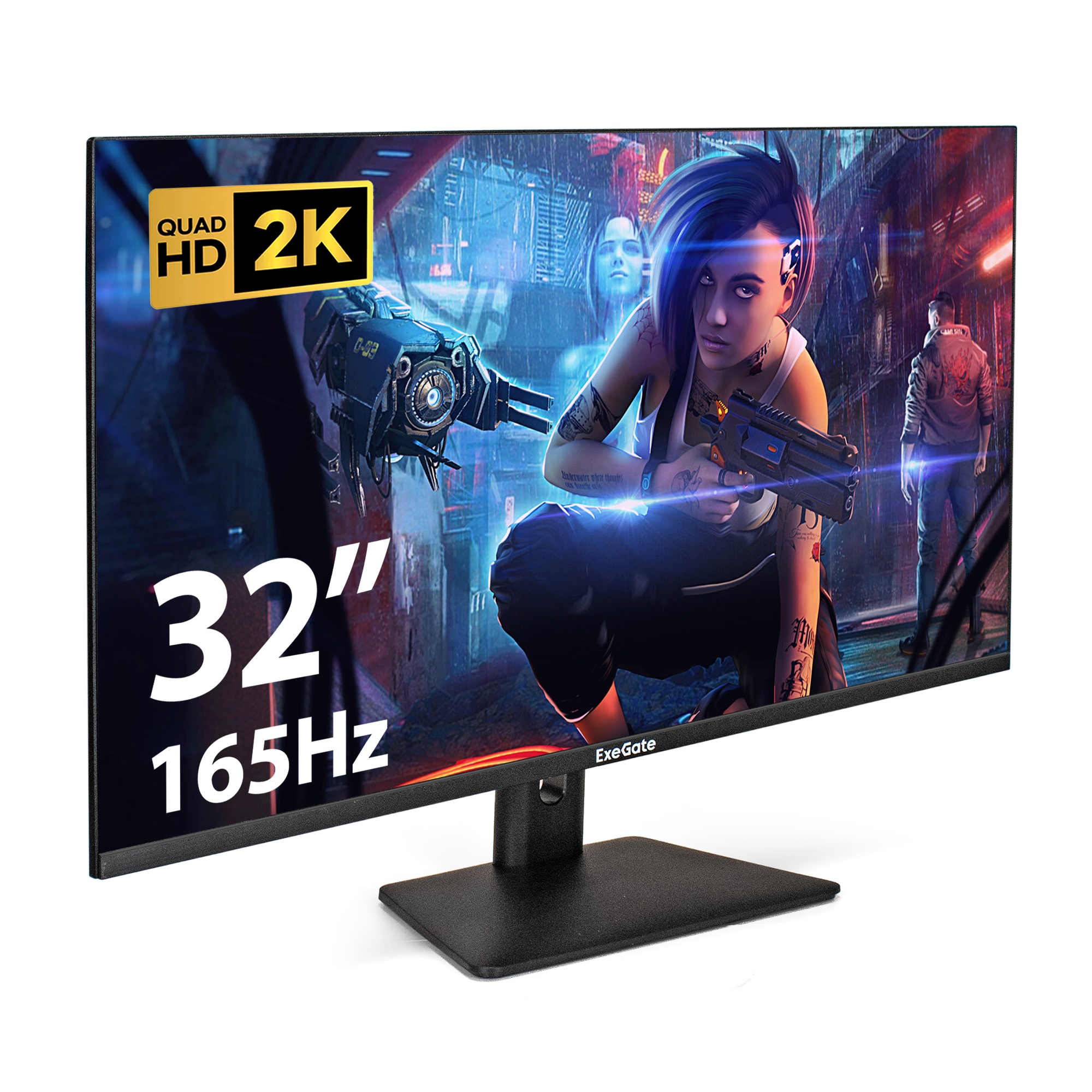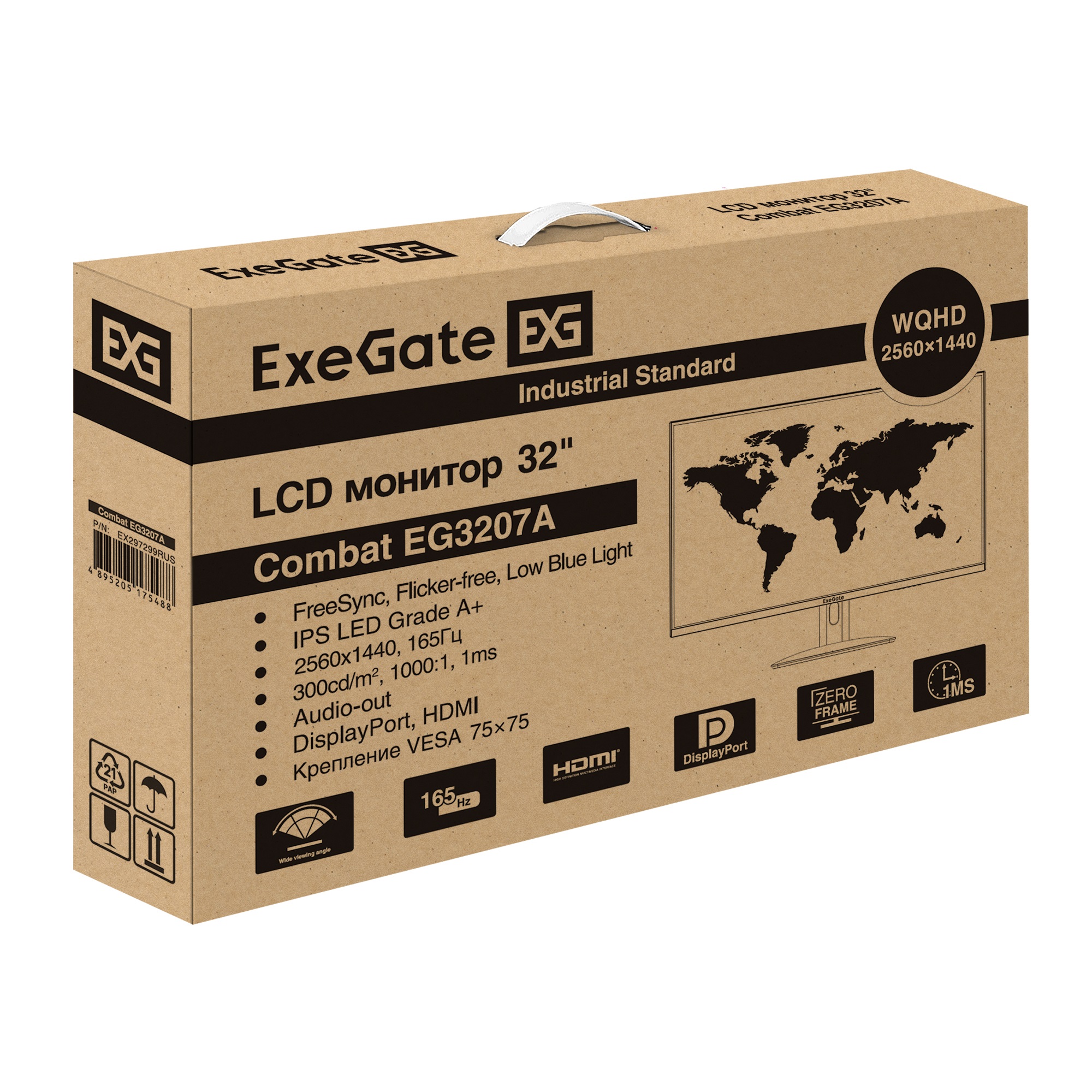 Повр. упаковка. Монитор игровой с аудио выходом 165 Гц 31.5" ExeGate Combat EG3207A (IPS LED Grade A+, 2K, 2560x1440@165Гц (WQHD), 16:9, 300cd/m2, 1000:1, 178°/178°, 1ms, 2xHDMI2.0, DisplayPort, USB, audio-out, Flicker-free, FreeSync, Low Blue Light, кабель DP 1.5м, VESA 75x75, регулировка наклона (tilt), черный)