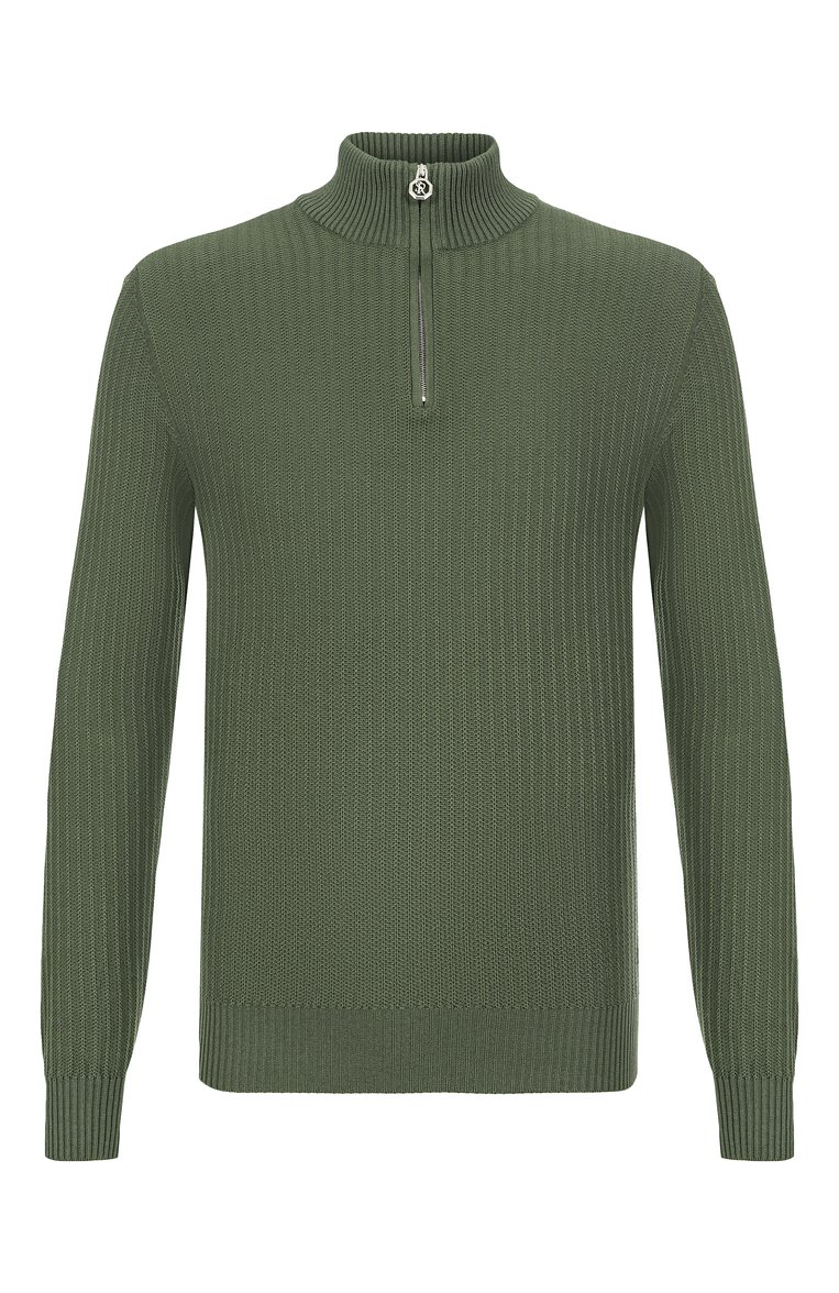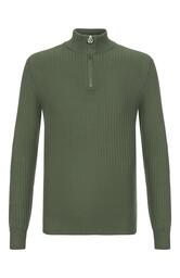 Для пошива джемпера в рельефную полоску использовали трикотаж с сетчатой фактурой, связанный из шелка и хлопка. Над ребристым поясом разместили небольшую металлическую эмблему марки. Ей вторит брендированный пуллер молнии на эластичной горловине.