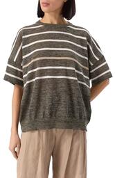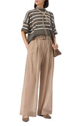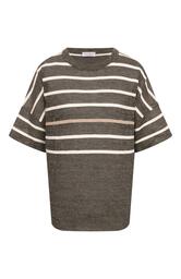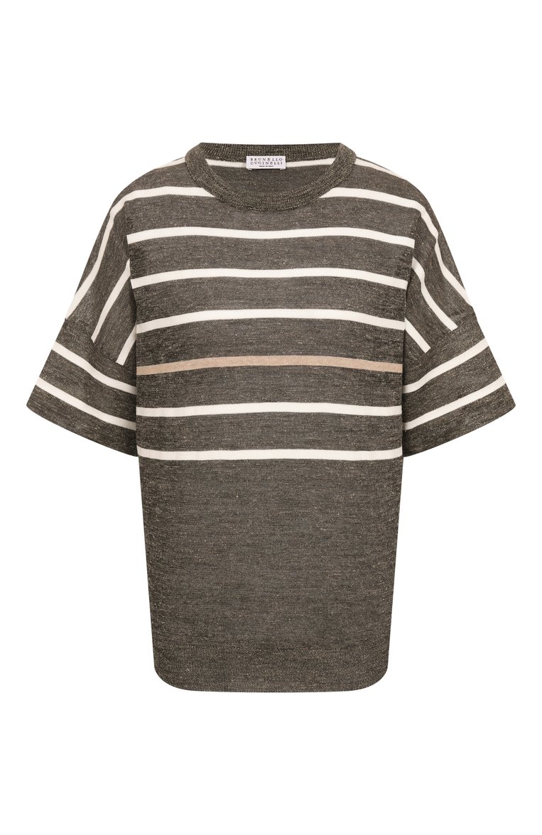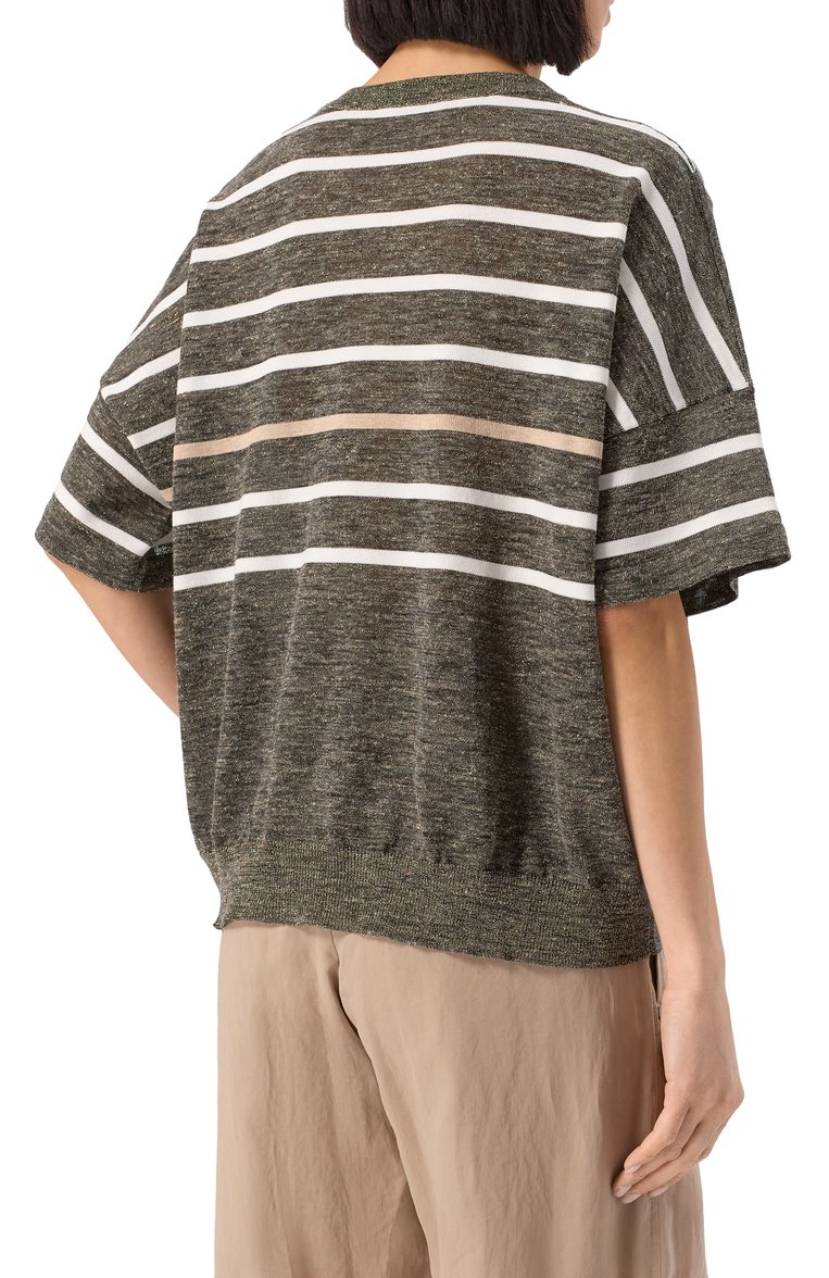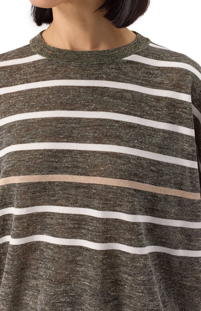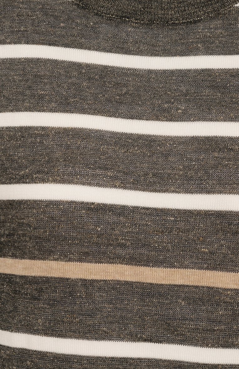 Пуловер в полоску изготовили из трикотажа на основе льна и полиэстера с добавлением металлизированных нитей ламе. Однотонные пояс и круглую горловину выполнили в мелкий рубчик.