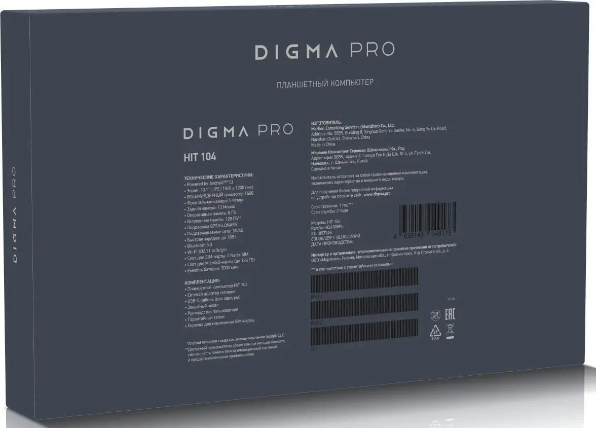 10.1" Планшет DIGMA PRO HIT 104 6/128 GB T606 4G, 1920 x 1200, Android 13, синий [hs1008pl]