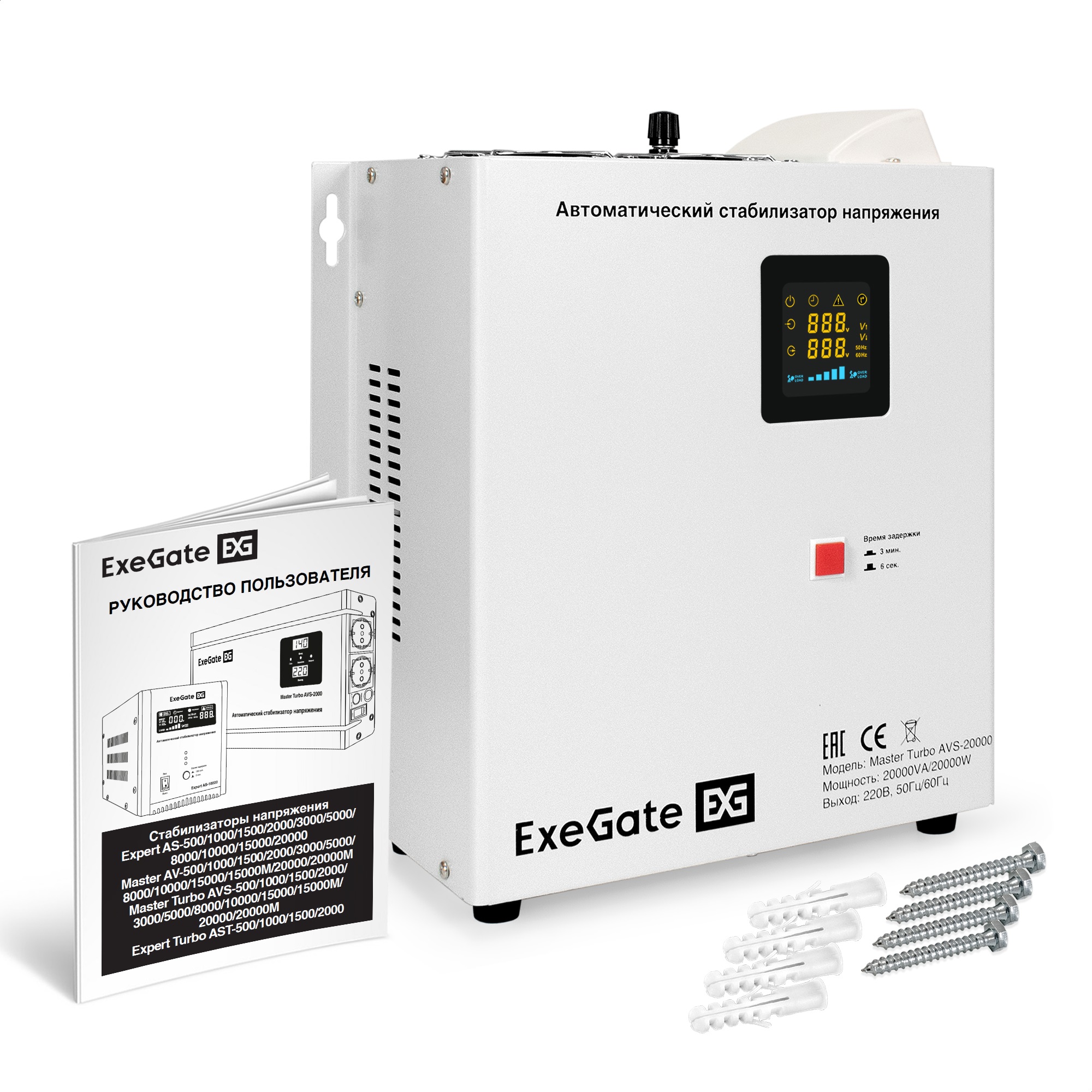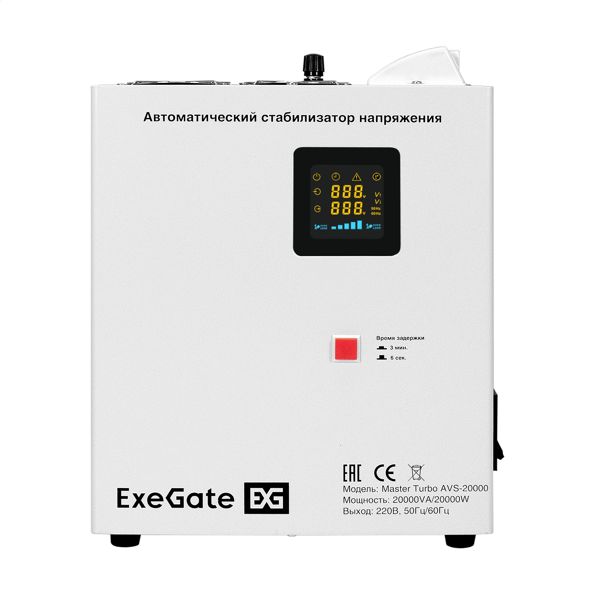 Стабилизатор напряжения настенный/напольный ExeGate Master Turbo AVS-20000M (20000ВА, вход 100-265В, цветной дисплей, выход 220В±8%, КПД 98%, 5 уровней защиты, задержка, усиленный метал.корпус, 1*Schuko+клем.колодка, RTL)
