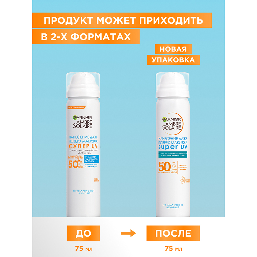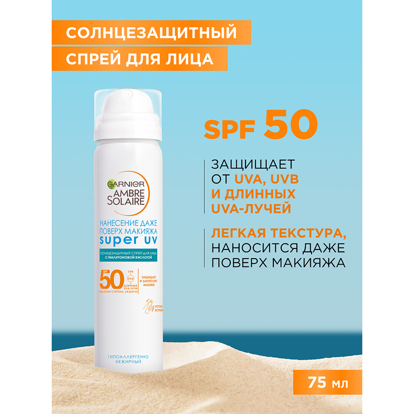 Спрей для лица `GARNIER` AMBRE SOLAIRE СУПЕР UV солнцезащитный с гиалуроновой кислотой SPF 50 75 мл