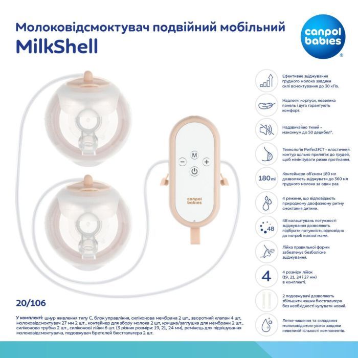 Комплектаціяшнур живлення типу С, блок управління, силіконова мембрана 2 шт., зворотний клапан 4 шт., молоковідсмоктувач 27 мм 2 шт., контейнер для збору молока 2 шт., кришка/заглушка для мембрани 2 шт., силіконова трубка 2 шт., силіконові лійки 6 шт. (3 різних розмі