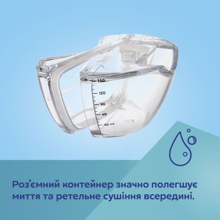 Комплектаціякорпус пристрою; клапан; контейнер для молока + ущільнювач; камера із мембраною; кабель USB Type-C; силіконовий ковпачок розміром 24 мм; 3 силіконові насадки-перехідники розмірами 17 мм, 19 мм і 21 мм.