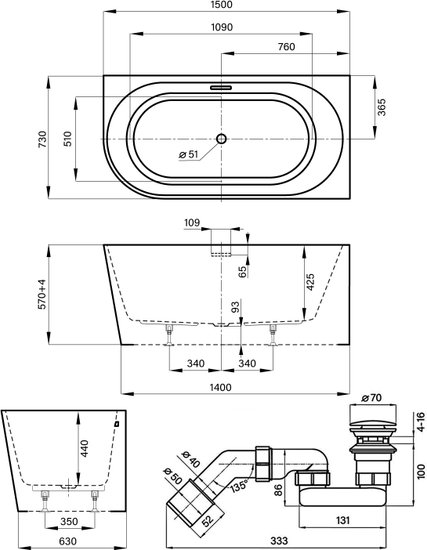 Excellence Pro 150x73 28761003R (пристенная ванна (правая) белый глянец, экран, ножки, сифон-автомат матовый черный)