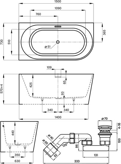 Excellence Pro 150x73 28760602R (пристенная ванна (левая) белый глянец, экран, ножки, сифон-автомат глянцевый белый)