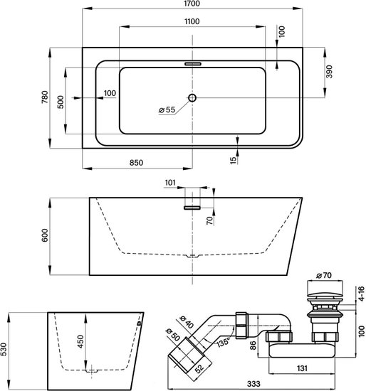 Bromance 170x78 23160403R (пристенная ванна (левая) белый глянец, экран, ножки, сифон-автомат матовый черный)