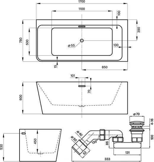• Глубина ванны 45 см