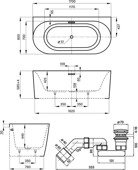Collaro 170x80 28910104R (пристенная ванна белый глянец, экран, ножки, сифон-автомат золото)