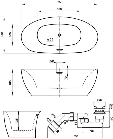 Enjoy e Amedeo 175x83 23740104R (отдельностоящая ванна белый глянец, экран, ножки, сифон-автомат золото)