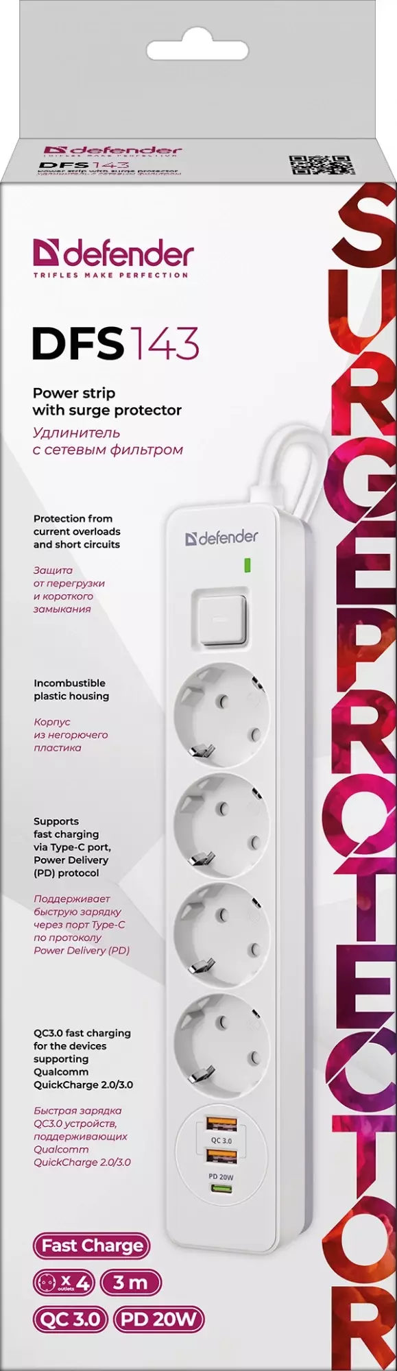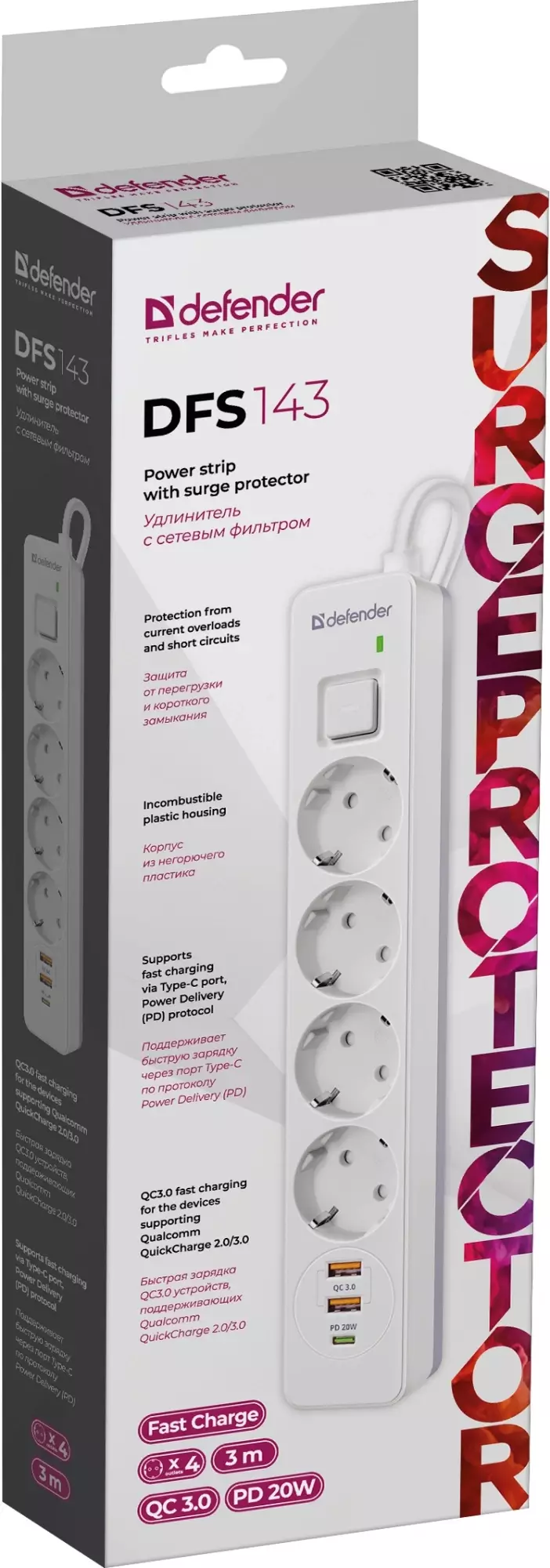 Сетевой фильтр Defender DFS 143 2м белый (99434)