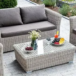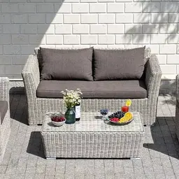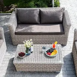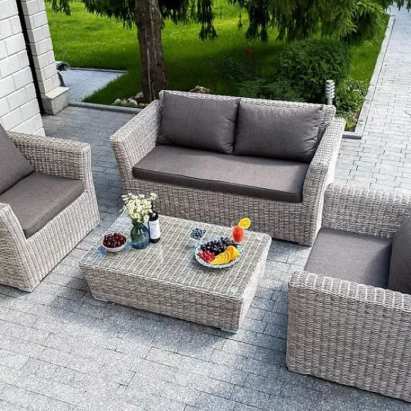 Диван выполнен из круглого искусственного ротанга, в основе алюминиевый каркас.
