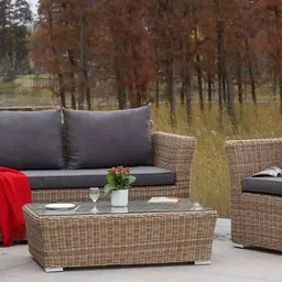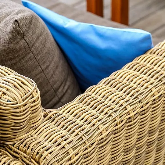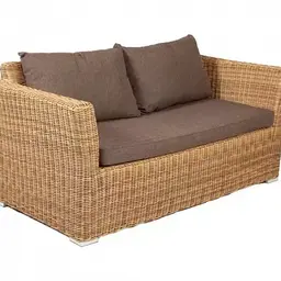 Диван выполнен из круглого искусственного ротанга, в основе алюминиевый каркас.