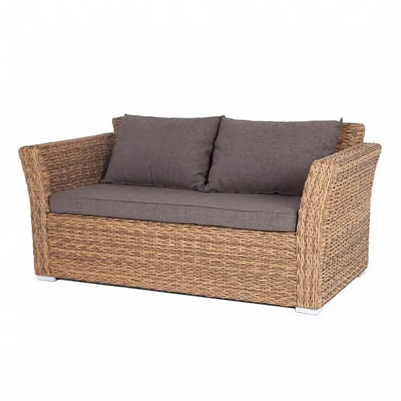 Диван выполнен из круглого искусственного ротанга, в основе алюминиевый каркас.